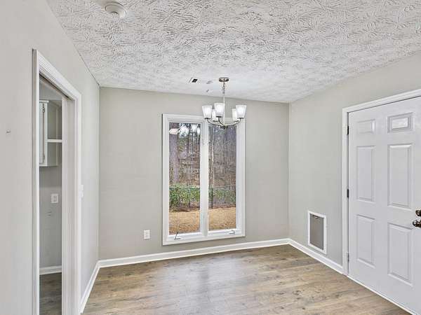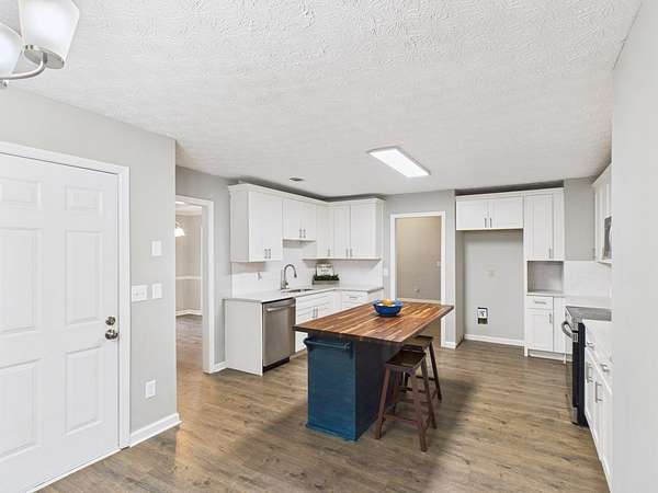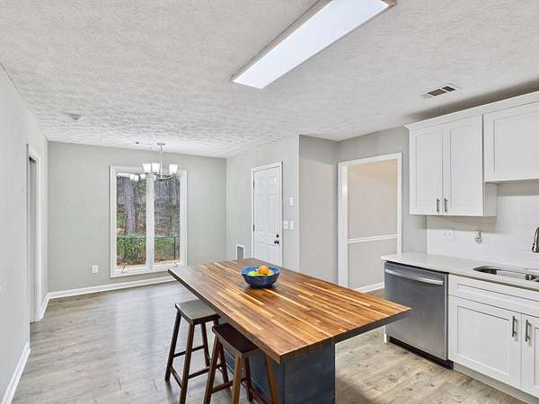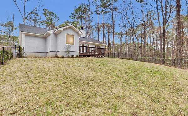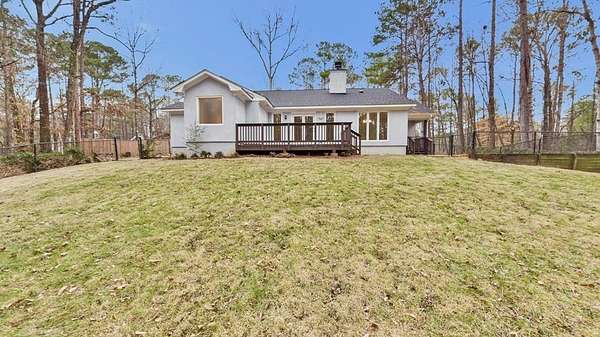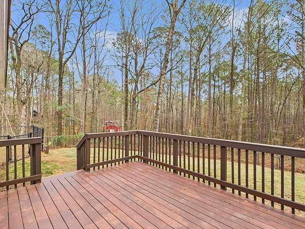 Welcome home to this inviting and thoughtfully updated home nestled on 2.14 acres in Harris County within the Dogwood Forest community. Luxury vinyl plank flooring welcomes you into a vaulted family room anchored by a cozy wood-burning fireplace with blower and hearth, creating a warm and comfortable gathering space. The eat-in kitchen offers a decorative island with seating for two and new stainless-steel appliances, ideal for both everyday living and entertaining. The primary suite is located on the right side of the home and features a walk-in closet and a separate vanity area leading into a spacious en-suite bath with double quartz vanity, jetted garden tub, and separate shower. Two additional bedrooms are situated at the front of the home and share a hall bath. The main living area flows effortlessly to the outdoors, where a fenced backyard and deck overlook peaceful wooded views. A separate fenced-in dog area with its own small porch is conveniently located off the breakfast area and includes a designated dog door. Additional highlights include pull-down attic stairs with fully floored storage, a dedicated laundry room with built-in cabinetry, and a 2-car garage equipped with a 240-volt outlet. Recent upgrades include newer windows, a 2023 water heater, and a roof just seven years old. This property offers a perfect blend of modern updates, functional features, and tranquil surroundings.