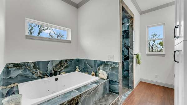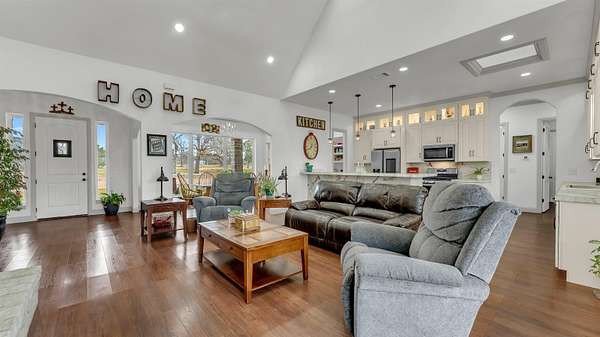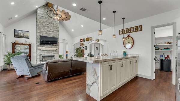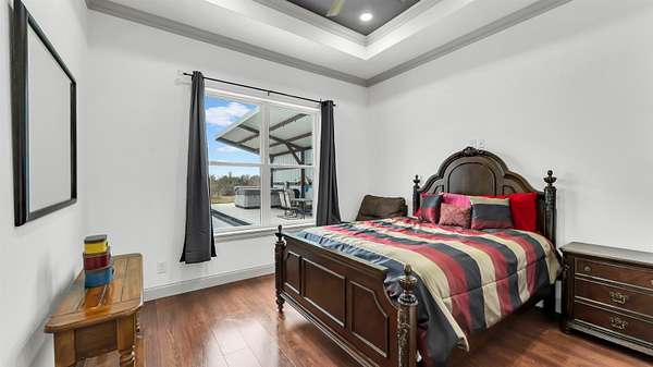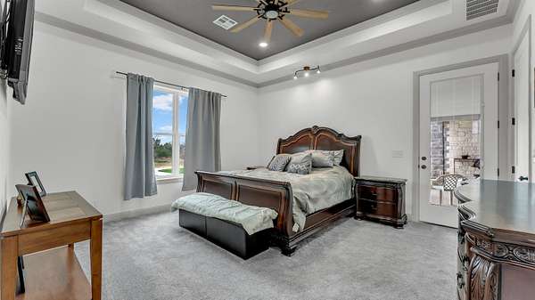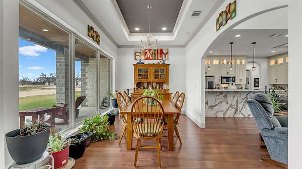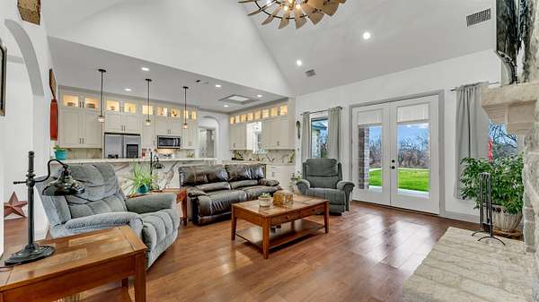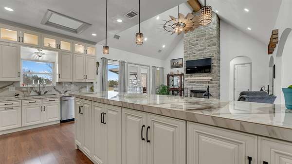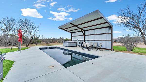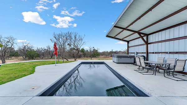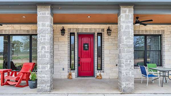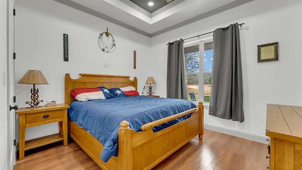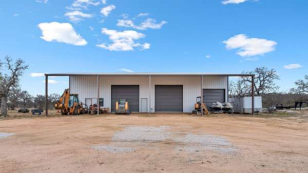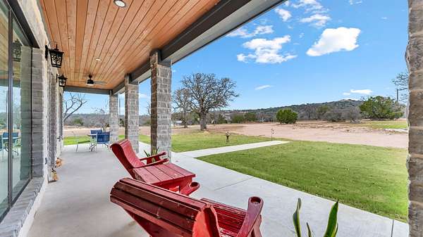 Welcome to 292 Oak Ridge Trail in Kingsland, Texas, a rare Hill Country property offering privacy, space, and top-tier improvements on 5 acres. This exceptional 3-bedroom, 2.5-bath home is thoughtfully designed for comfort, efficiency, and entertaining. The home features an open-concept layout, an amazing kitchen highlighted by a large marble island with breakfast bar, custom cabinetry throughout, and a butler's pantry-perfect for hosting and everyday living. Each room has a tray ceiling with recessed lighting and decorative lighting. Tons of natural light flow through the home, offering beautiful views of the pool area. The living room is warm and inviting, ideal for gatherings, and features a wood burning rock fireplace. The primary suite is a true retreat with a soaking Jacuzzi tub, walk-in tile shower with multiple rainfall shower heads, and dual vanities. The laundry room includes extensive custom cabinet storage, keeping everything organized. Outside, enjoy an inground pool with unique covered area, hot tub, sprinkler system, and covered front and back porches-perfect for relaxing or entertaining. The property includes two wells and a 50x80 red steel metal shop with spray foam insulation, water, electric hot water heater, and bathroom, making it ideal for a workshop with 3 nice size roll up doors. Additional features include 6-inch foam insulation in the ceiling for energy efficiency, well, septic system, and partial fence.