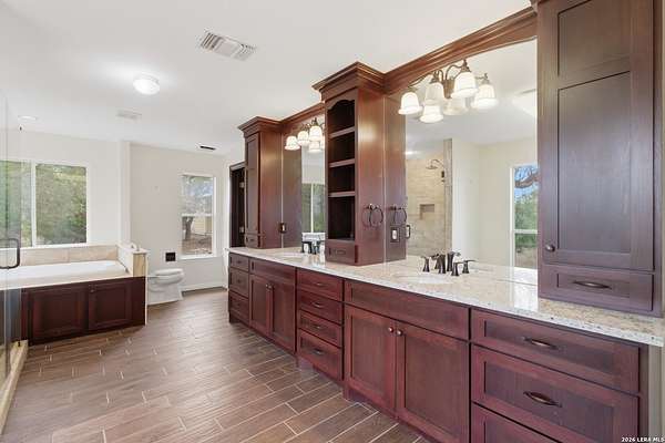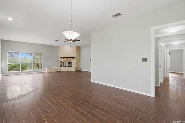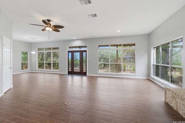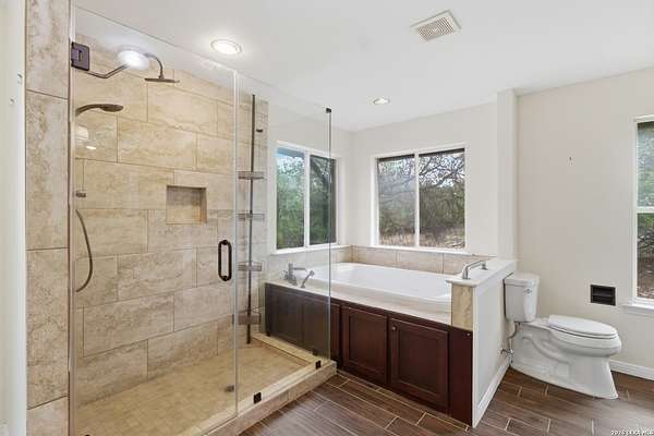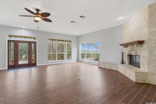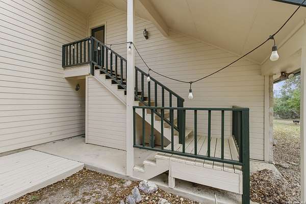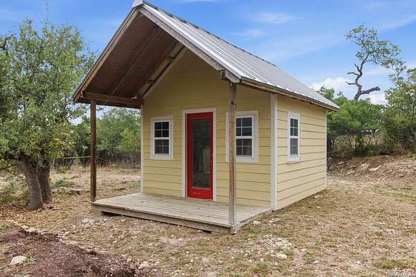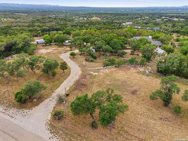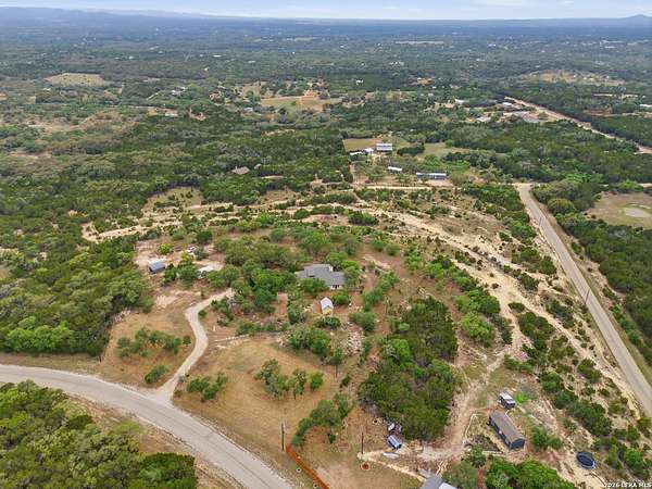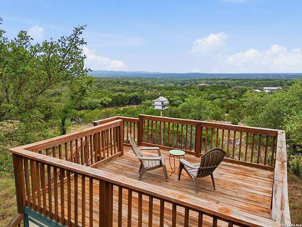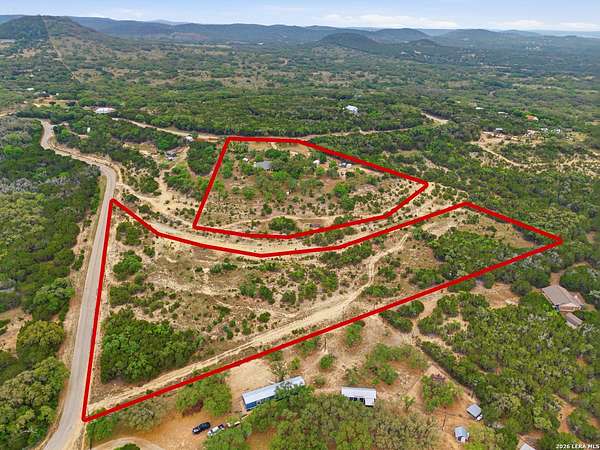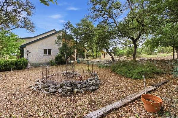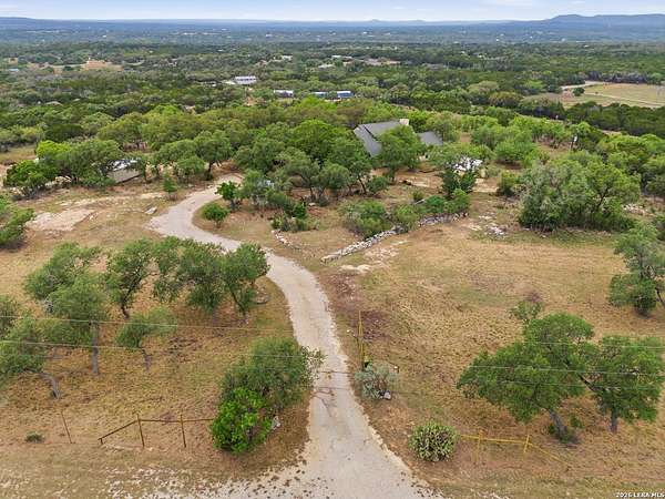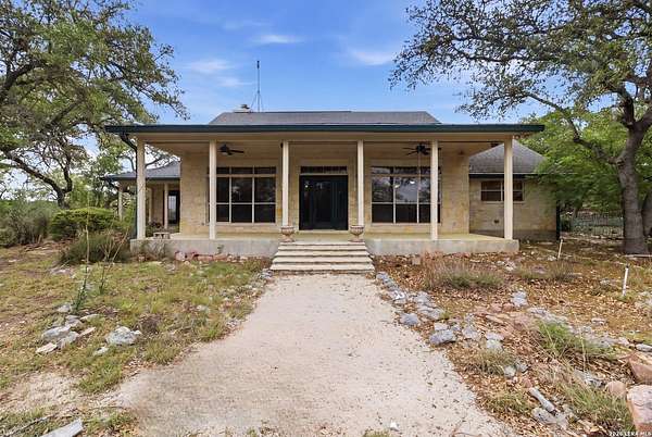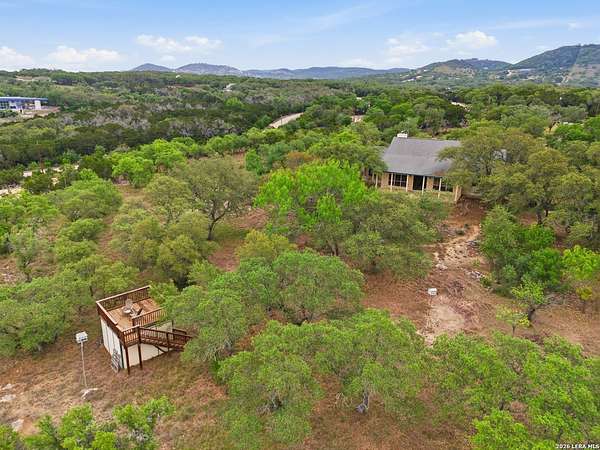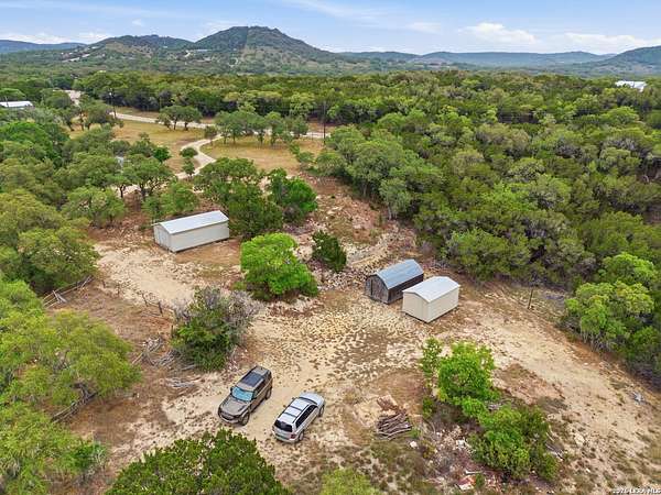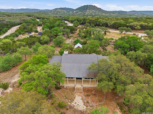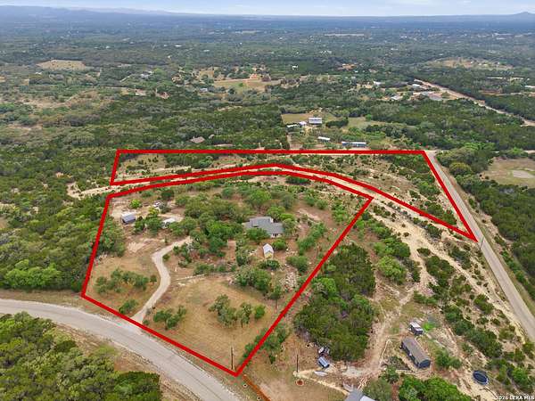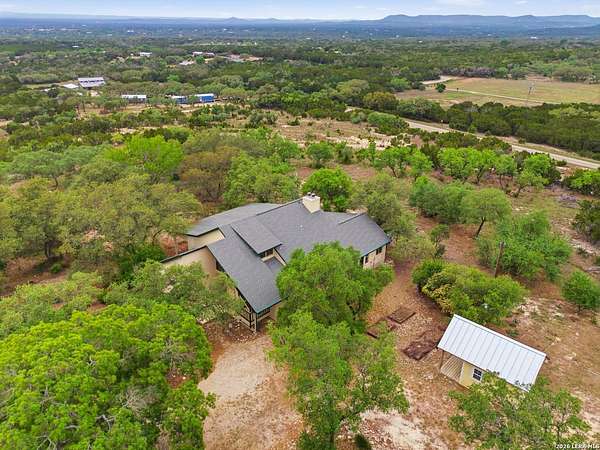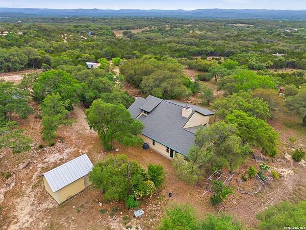 This beautiful Custom-built HILL COUNTRY STYLE home, perched atop rolling hills and on 10 acres, offers sweeping countryside views and exceptional privacy! A winding private driveway leads you to the welcoming residence, you'll notice tons of yard space and room to grow. Gorgeous, warm wood floors accent the spacious living and dining areas. Enjoy BREATHTAKING vistas from the expansive front porch- perfect for relaxing or entertaining. INCREDIBLE VIEWS throughout the property! Numerous greenery areas and thoughtfully placed potted plants throughout and enhance the natural beauty and create a peaceful setting. The home features two fireplaces, one in the inviting living area and another in the serene primary bedroom. The beautifully updated primary bath offers a luxurious retreat with a glass-enclosed shower and jetted soaking tub. The third bedroom, located on the second floor, FEATURES private exterior access, offering flexibility for guests, a home office, or private living quarters. Several multi-purpose sheds provide excellent STORAGE, workshop, or hobby space. One shed offers great potential to be converted into a man cave, she shed, or entertainment area, with balcony space to relax and take in the amazing views. Sunset views from this property are truly incredible! Short drive to Bandera and San Antonio!