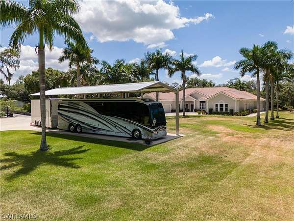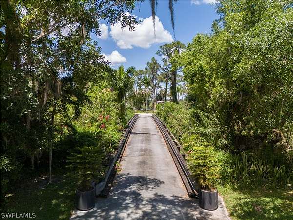 Welcome to Peacock Isle! Drive through the automated gate and across the concrete bridge onto your own private 8+/- acre tropical paradise island. The island is 5+ acres with an additional 3+ in Corps Right-of-Way. Take a walk around the island along the mile long shelled walking path and enjoy the river views, beautiful tropical foilage, oak trees and a variety of fruit trees. The 4500 SF under air (3 units) brick home features 3 bedrooms all ensuite, den/office (could be 4th bedroom), dining area, butler's pantry with second dishwasher. Huge kitchen with eating area and two living areas all have views of the screened lanai, outdoor kitchen and pool.The main bedroom suite features a sitting/reading area, exercise/hobby room, private laundry, his and hers closets, and large bathroom with dual sinks, jetted tub, walk-in shower, and toilet closet with bidette. There is a second laundry/storage room adjacent to the two guest bedrooms. Home has cathedral and 12' ceilings throughout with decorative ceiling details, crown moldings and custom crafted wood cabinetry throughout. Comes with central and baseboard vacuum. Park your vehicles in the two attached double garages and park your motor coach on one of two awninged concrete pads with 50 amp pedestals, water and private sewer. Dock your pontoon boat (comes with sale of home) at your private dock with lift. it will be ready for you to explore the surrounding waters and the Gulf via boat lock. The concrete block barn with two roll up doors provides ample storage space for all your outdoor gear, boat and coach. Home has a full house 20k generator with 1000 gal underground LP tank, underground electric, and a 6" well for full house RO system and sprinkler system.