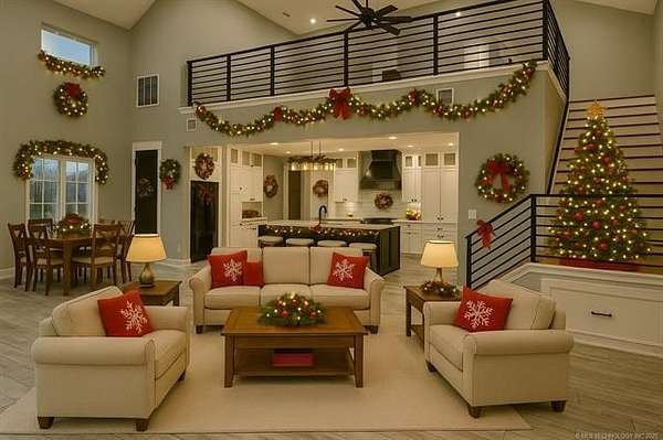 Open-concept layout with vaulted ceilings, cedar beam, and stylish black iron loft railing.