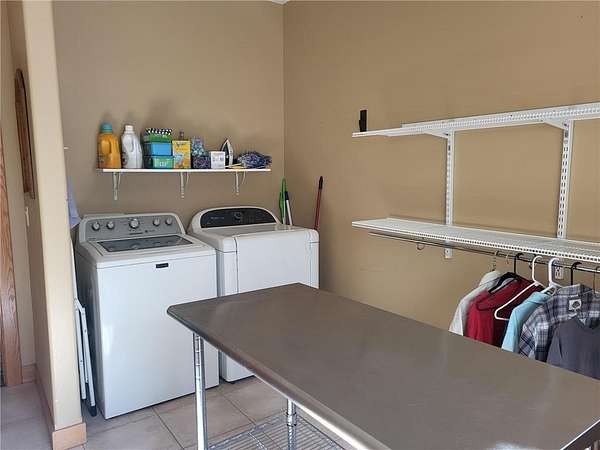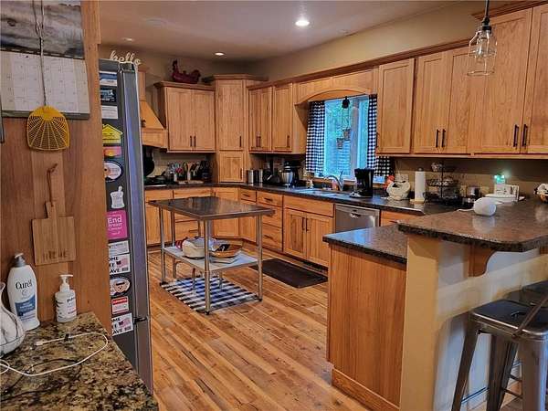 From the moment you pull into the meticulously landscaped driveway, this Pleasant Lake home will captivate you. Step inside and be greeted by an awe-inspiring custom kitchen, a true chef's delight, boasting stainless steel appliances including double ovens, a cooktop, dishwasher, 3-door refrigerator, microwave, and a stunning stainless steel center island. Enjoy breathtaking lake views from the large window above the sink.