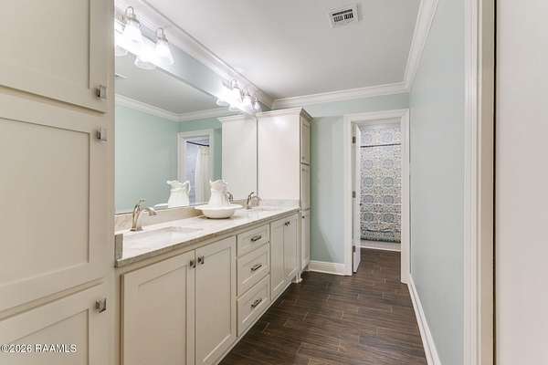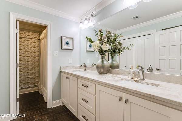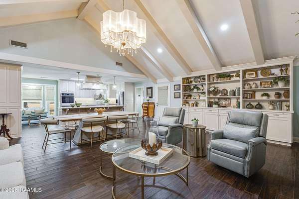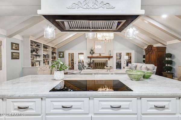 - 9+ ft Ceiling, Attic Access, Beamed Ceilings, Bookcases, Built-In Features, Built-Ins, Cathedral Ceiling, Cathedral Ceiling(s), Crown Molding, Double Vanity, Dual Closets, Electric Dryer Con, Electric Stove Con, Electric Washer Con, Granite Counters, Guest Suite, High Ceilings, In-Law Floorplan, Kitchen Island, Primary Bath, Varied Ceiling Heights, Walk-In Closet(s), Walk-In Pantry