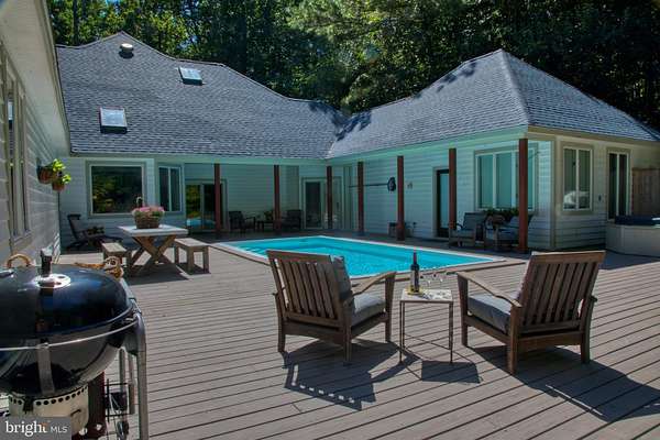 A rare offering of timeless elegance and privacy, this serene 5-acre country retreat is the perfect haven for gatherings with family and friends. A long gravel driveway winds through mature trees, leading to a gracious double-door entry and a custom-built residence with an open, light-filled floor plan. At the heart of the home, a chef's kitchen showcases premium stainless-steel appliances and a walk-in pantry, seamlessly flowing into both formal and casual living spaces. Two inviting living rooms with wood-burning stoves, a refined dining room, and a luxurious primary suite provide spaces designed for comfort and sophistication. The primary suite is a true sanctuary with a spa-inspired bath featuring a whirlpool tub, private sauna, walk-in shower, and expansive walk-in closet. Natural light streams through skylights and broad windows, framing views of the sparkling in-ground pool and manicured grounds. Beyond the main residence, the property offers three additional guest bedrooms, a detached studio/office that may also serve as a nanny suite, and ample parking with a three-car garage, plus a separate fourth RV garage equipped with 220 voltage. Three large sheds tucked at the rear of the property with infinite possibilities... work room, children's play house, additional storage and a charming fenced vegetable and flower garden. With no HOA restrictions, you'll enjoy complete freedom to make the property truly your own. Tucked away at the end of a private drive and surrounded by natural beauty, this retreat blends refined living with tranquility-just minutes from the beach. A property of this caliber must be experienced in person to be truly appreciated. Please contact me for a private tour.