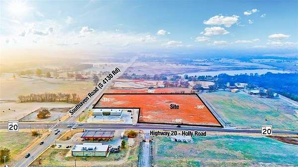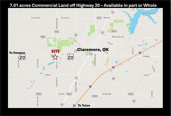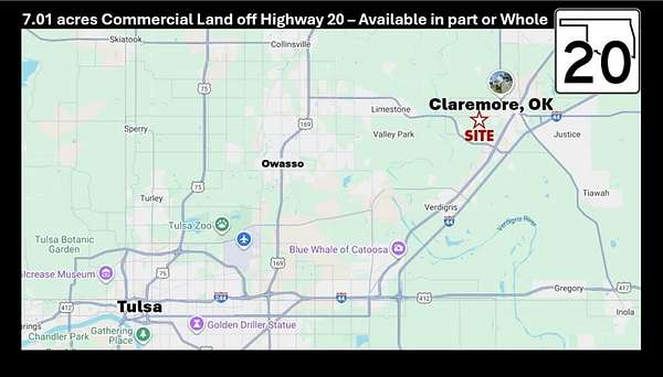 Hwy 20 (Holly Rd) & Southaven Rd, Claremore, OK Prime corner commercial land at the southwest intersection of Oklahoma State Highway 20 (Holly Road) and Southaven Road - a major arterial corridor connecting Claremore and Owasso. Located 1.25 Miles W' of McDonalds, Chick-Fil-A and Starbucks! This hard-to-find 7.01 acre tract is ideal for retail pads, medical/professional office, automotive, light industrial, multi-tenant retail, or a phased mixed-use development. Total acreage: 7.01 acres (can be subdivided to meet your needs with flexible parcel sizes: 1.3 acres up to the full 7.01 acres - divisible as required. Gross list price (all 7.01 acres): $700,000. Individual pads/tracts available: $160,000 - $225,000 per tract (pricing varies by pad size and final configuration; individual pricing may differ from the overall listing price). Utilities and site access: corner frontage on a primary state highway with excellent visibility and ingress/egress potential (buyers should verify utility availability and exact access with local authorities). Traffic & Transportation - Highway 20 is a primary east-west arterial through Claremore that connects into the Tulsa metro area and directly links Claremore with Owasso - the drive between Claremore and Owasso is roughly 17 miles. According to the Oklahoma Department of Transportation (ODOT) 2023 AADT maps for Rogers County, state highway traffic volumes along SH-20 through the Claremore area show annual average daily traffic (AADT) values generally in the mid-teens to mid-twenty-thousands at nearby count locations - ~20,000 AADT, demonstrating strong daily vehicle exposure for commercial users. (Buyers should request precise count locations and the most recent ODOT counts for exact intersection numbers.)