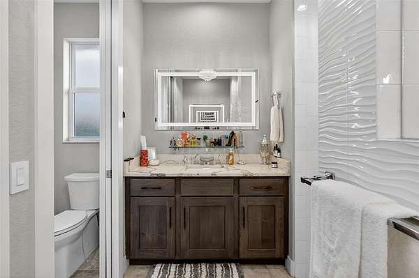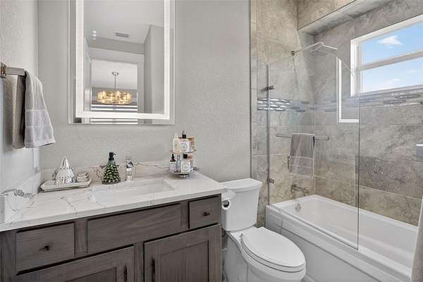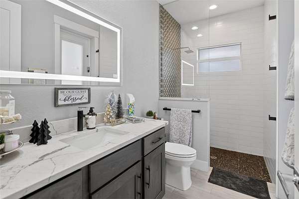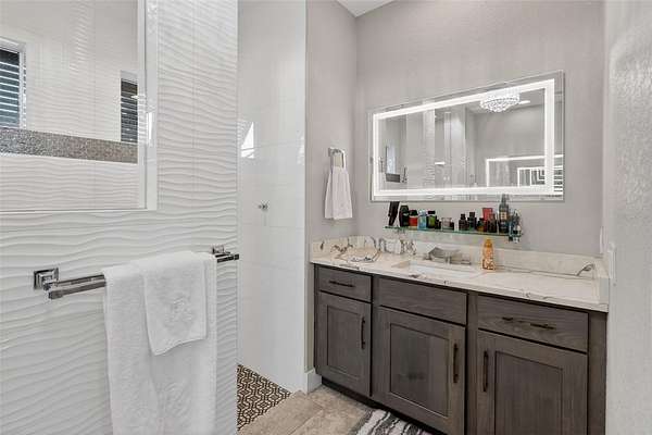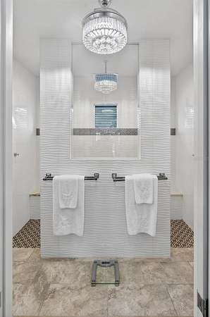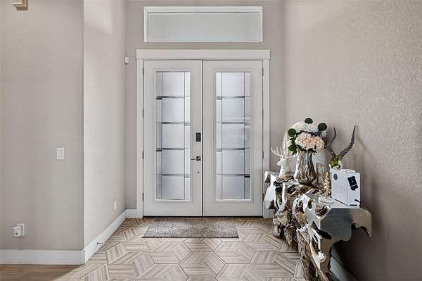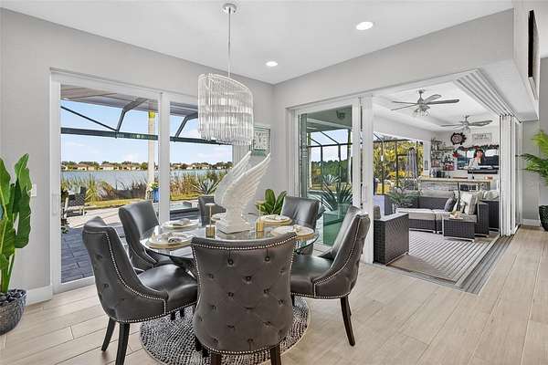 Outdoor living is ideal for entertaining with a 30’ x 12’ covered patio, built in bar and TV, ceiling fans, and indoor/outdoor speaker system. The saltwater pool and spa include upgraded lighting, automation, and a clear view screen enclosure.