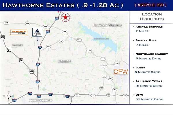 Discover the perfect blend of tranquility and convenience at Hawthorne Estates, Located at 880 Faught Rd, brand-new community nestled in the heart of Northlake, Texas. With 27 spacious lots ranging from .9 to 1.27 acres, this haven offers a peaceful and scenic retreat for homeowners.
