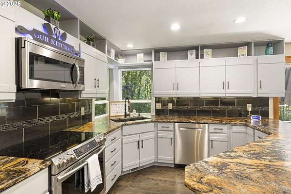 - Builtin Range, Dishwasher, Microwave, Plumbed For Ice Maker, Solid Surface Countertop, Stainless Steel Appliance