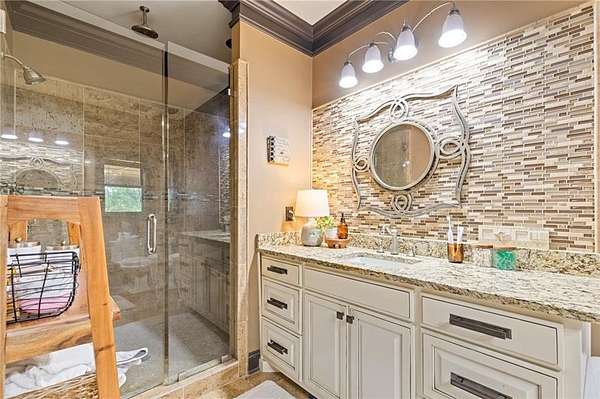 - Beamed Ceilings, Bookcases, Double Vanity, Entrance Foyer, High Ceilings, High Ceilings 9 ft Lower, High Ceilings 9 ft Main, High Ceilings 9 ft Upper, Tray Ceiling(s), Vaulted Ceiling(s)