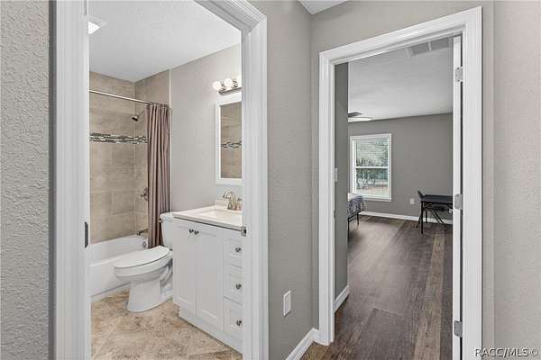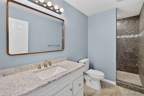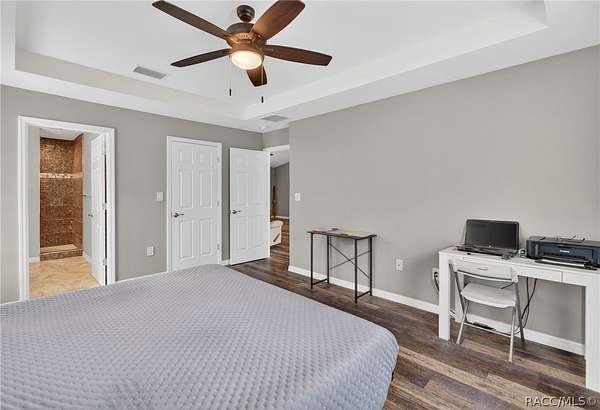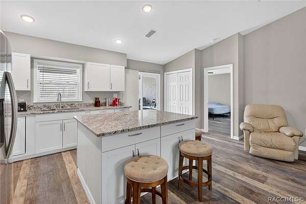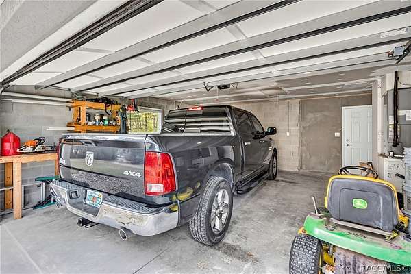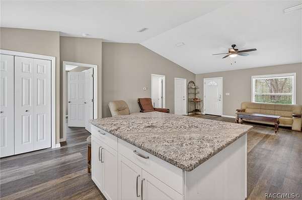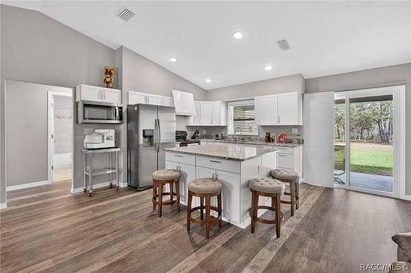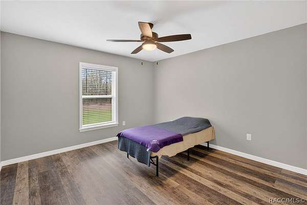 Built in 2021, this modern home offers an open floor plan with a spacious living area and an eat-in island kitchen featuring stainless steel appliances, granite countertops, and abundant cabinet space. Luxury vinyl plank flooring and ceiling fans run throughout the home. The expansive primary suite includes a tray ceiling, walk-in closets, and a custom-tiled walk-in shower, while the guest bath offers a tub/shower combo. Relax on your large covered open patio overlooking 2.34 private acres in a quiet area with minimal traffic. Fully fenced with a double gate. Lots of nature surrounding, birds, gorgeous Live Oaks and beautiful Azaleas in bloom right now. Conveniently located just one mile from Lowe's and Walmart, with easy access to SR 589 and I-75. Enjoy nearby boating, manatee encounters, and the best of Florida's Nature Coast