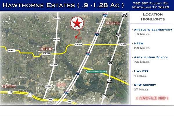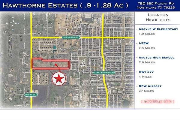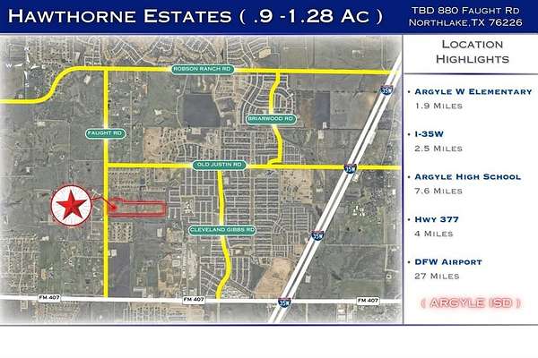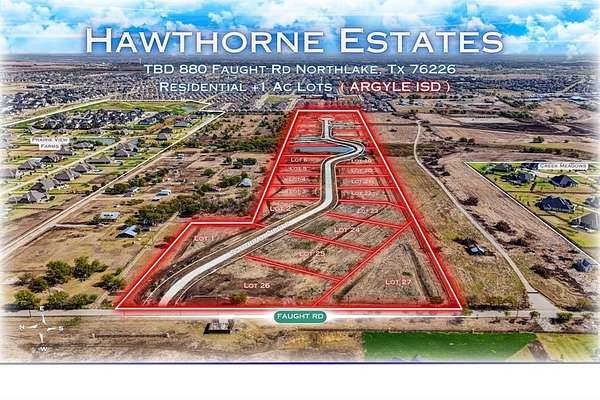 Discover the perfect blend of tranquility and convenience at Hawthorne Estates, Located at 880 Faught Rd, brand-new community nestled in the heart of Northlake, Texas. With 27 spacious lots ranging from .9 to 1.27 acres, this haven offers a peaceful and scenic retreat for homeowners.
