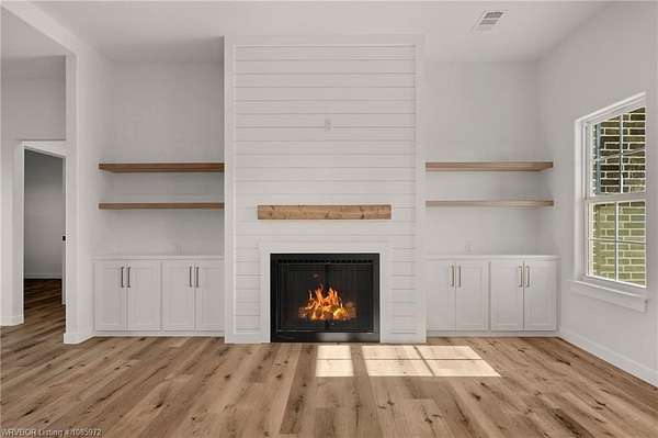 The open living area is highlighted by a gas-log fireplace with shiplap surround, custom built-ins, and a beamed ceiling, creating a warm and inviting focal point. The kitchen blends function and farmhouse charm with painted cabinetry, a farmhouse sink, and a large island with built-in microwave accented by black and brass pendant lighting, all complemented by luxury vinyl plank flooring throughout the entire home.