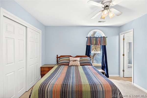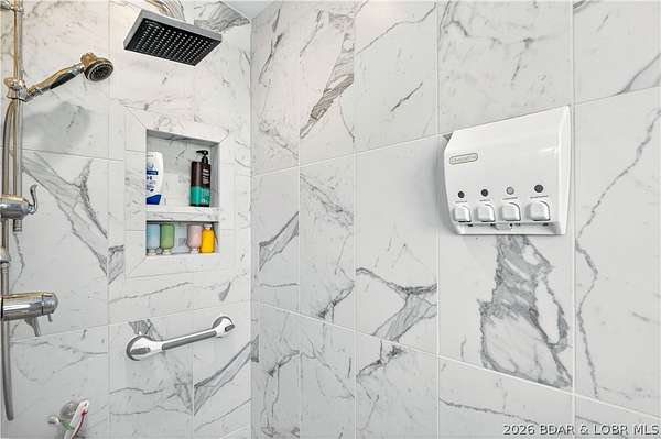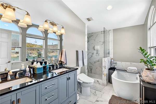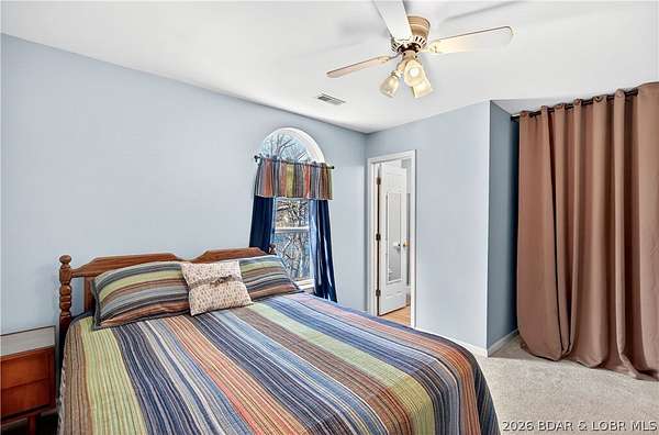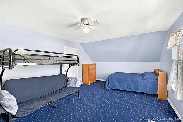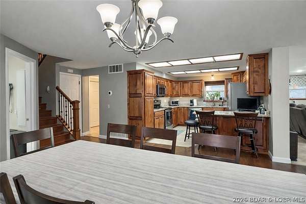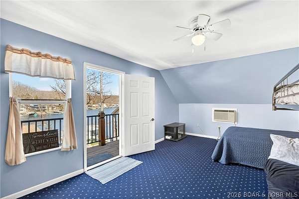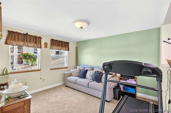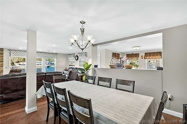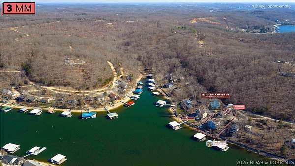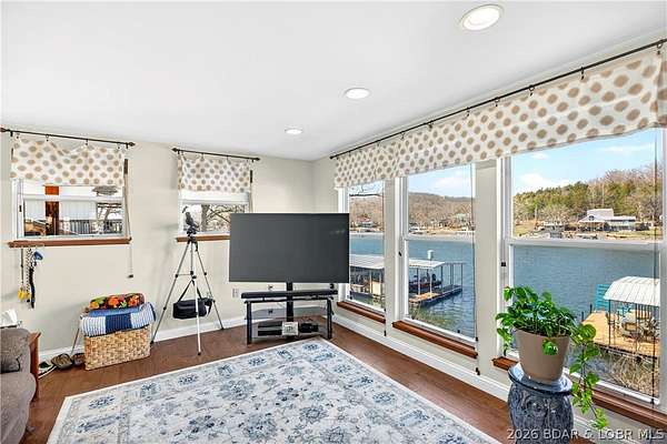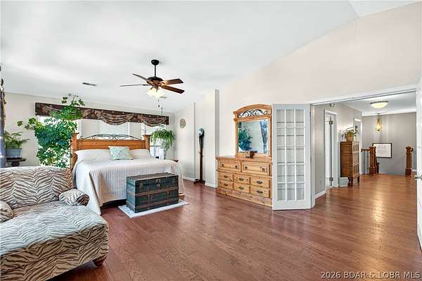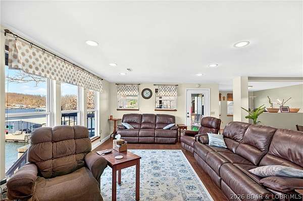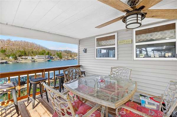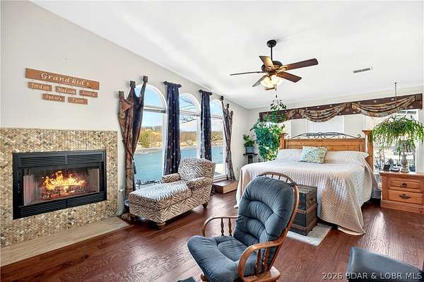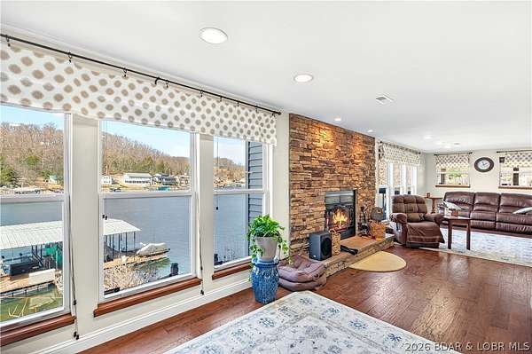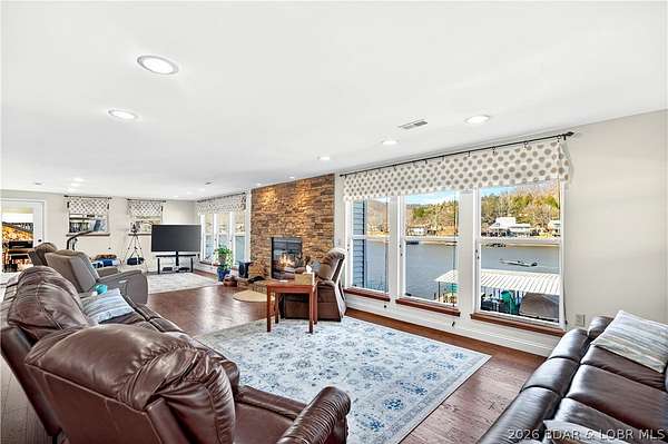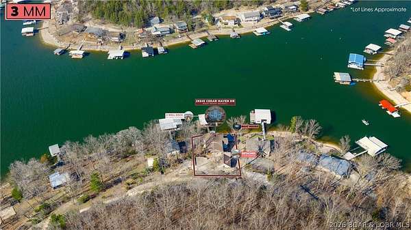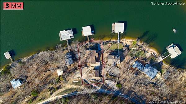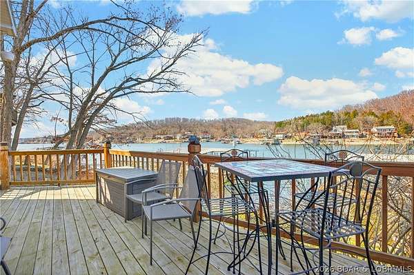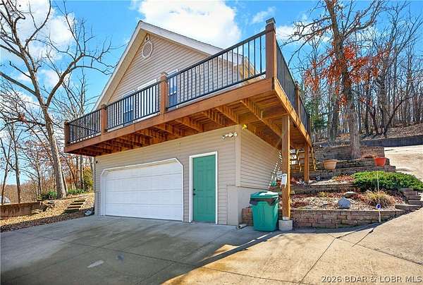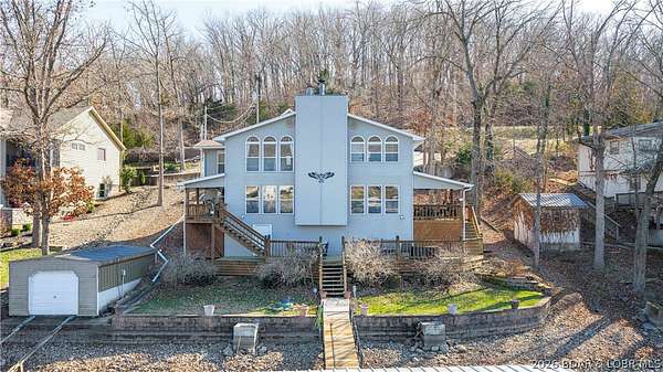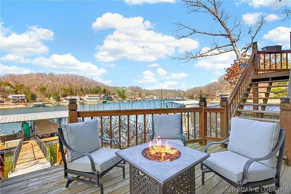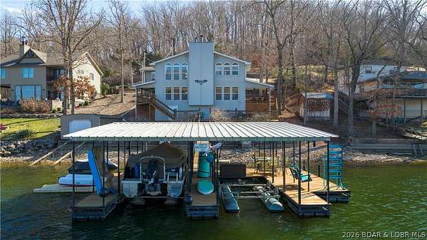 Just in time for Summer! Large home, guest bunkroom, oversized garage, dock & acreage all included! You will love the amount of space in this lakefront home on the Gravois arm of the Lake. This home stuns with 4 Bedrooms and 4 Baths and approximately 2900 sq.ft. The Primary Suite is luxurious... fireplace, soaker tub, large walk-in shower, walk-in closet, great views and a HUGE bedroom space with engineered hardwood floors. The main level also offers an additional 3 bedrooms (one of which is an en-suite) and another full bath. The lower level features a gorgeous kitchen with custom cabinets, granite countertops and pantry w/pull-out drawers and upgraded appliances. The living area easily holds multiple seating areas, great views, and offers access to two different deck areas. This floor also boasts a large dining area, another bath, bonus room and laundry. Need addt'l space....there are additional sleeping quarters/bunkroom above the garage and even more space that could be finished. The second tier lot is included for a total of 3 +/- acres. The boathouse is could be used as a game room, hang out area or storage for your water toys. Dock & lifts are included. Priced to SELL!