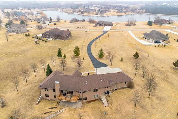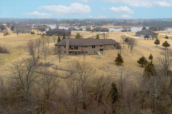 Custom-built ranch offering approximately 2,900+ square feet above grade and nearly 5000+ square feet of finished living space including the beautifully finished walkout lower level - all set on 5.67 private wooded acres backing to a ravine. The open floor plan features soaring vaulted ceilings, hardwood floors, and three gas fireplaces. The gourmet kitchen includes granite countertops, cherry cabinetry, stainless steel appliances, and a walk-in pantry. This 3-bedroom, 3 full and 1 half bath home offers oversized walk-in closets throughout and a convenient first-floor laundry with additional storage. The primary suite features a see-through fireplace shared between the bedroom and spa-inspired bath. The finished walkout basement adds substantial additional living space with a full bath, storage area, built-in storm shelter, and patio access. A deck off the main-level eating area overlooks peaceful wooded views. Located in a custom home community centered around a scenic lake with a walking path.