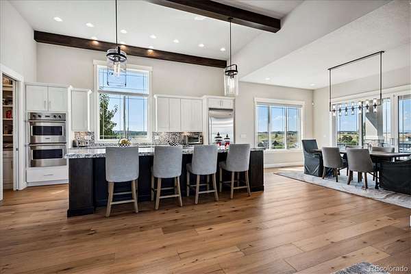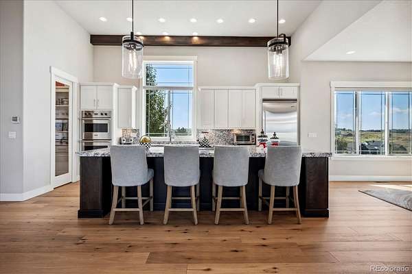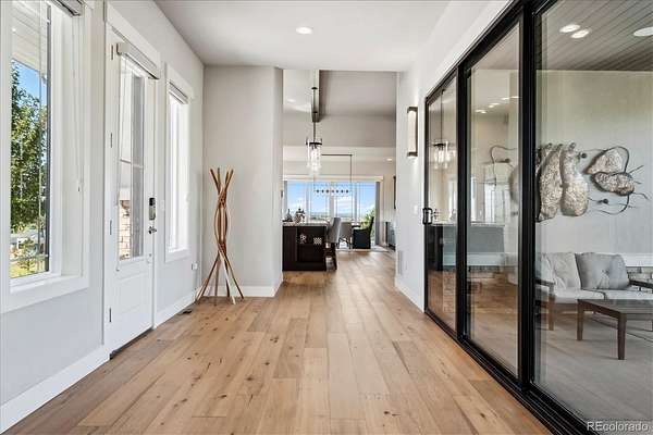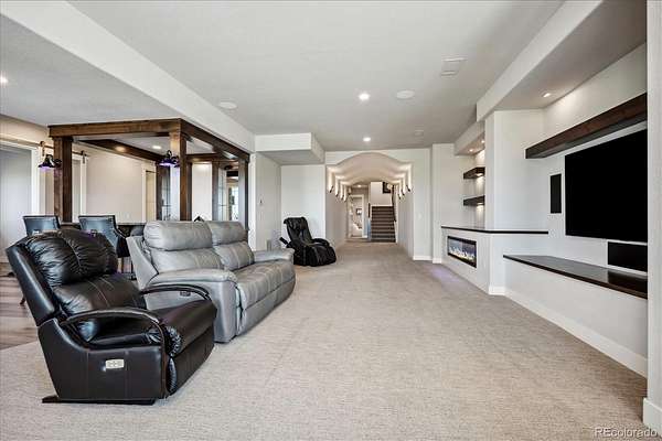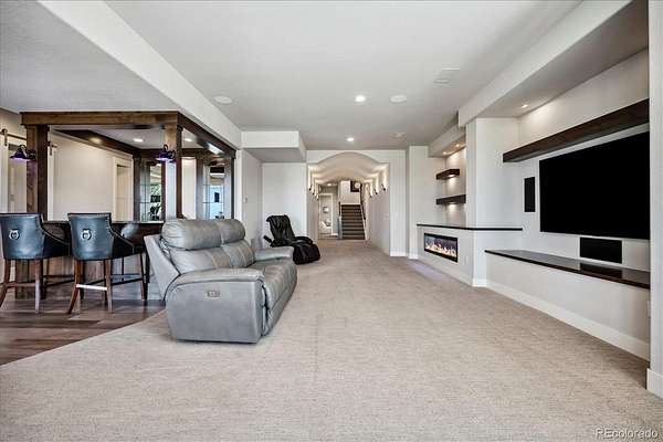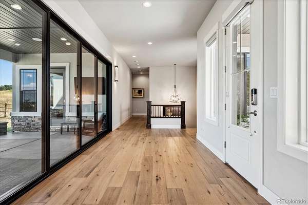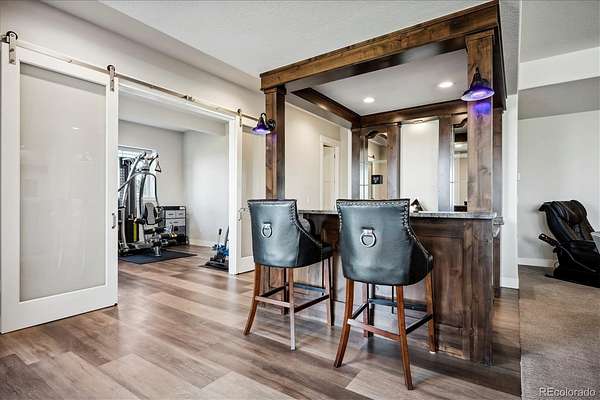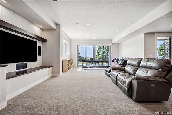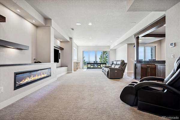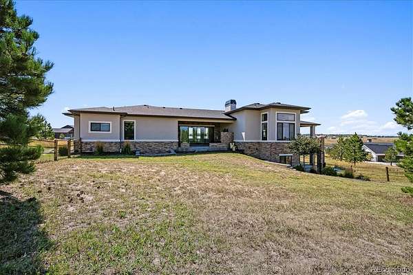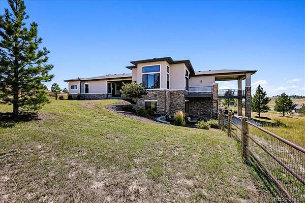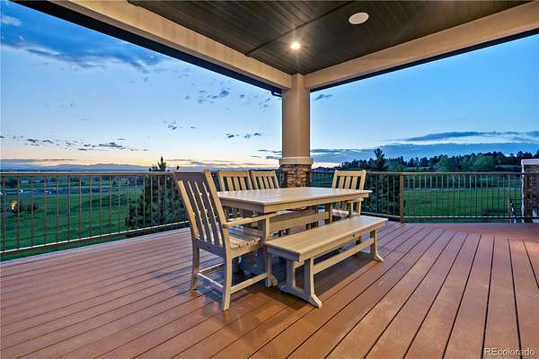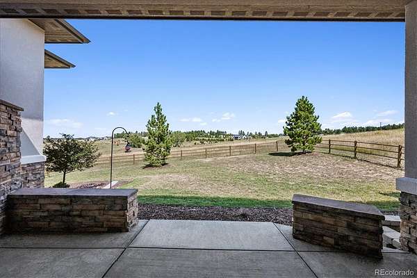 Positioned to live as a true 6 bedroom home, with a gym and private studio (egress) as conforming options, this is one of the most compelling opportunities in highly sought after Fox Hill at just $333 per square foot. The coveted walkout ranch sits on 2.1+ private acres at the end of a cul de sac with over $200,000 in upgrades. The arrival sets the tone with a covered outdoor living through expansive multi slider doors, fireplace, and A/V for year round entertaining. The chef’s kitchen features an oversized granite island, Viking appliances, and flows to the dining room with sweeping Pikes Peak and Rocky Mountain views and an expansive Trex deck. The living room offers soaring ceilings, exposed beams, and custom finishes. The main level primary retreat includes dual vanities, dual closets, soaking tub, and oversized shower. The main level is complete with an additional bedroom and bath. The walkout lower level features a full theater, dual sided bar, living space, 2 bedroom suites, and 2 additional flexible rooms (gym and studio). The stunning lot offers a fenced parcel, covered patio wired for spa, 22 Ponderosa pines, and full irrigation. A 4 car garage with epoxy floors completes the home. Tech includes URC smart home A/V, fiber Ethernet, Denon THX theater, security system, and a permitted recording studio. Additional upgrades include water softening, reverse osmosis, recirculating water heater, humidification, and Trex deck drainage. As the community’s original model, this home commands the premier lot—offering the most elevated position and sweeping, unobstructed views in all of Fox Hill, a setting that simply cannot be replicated.