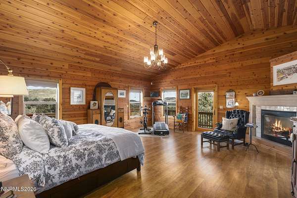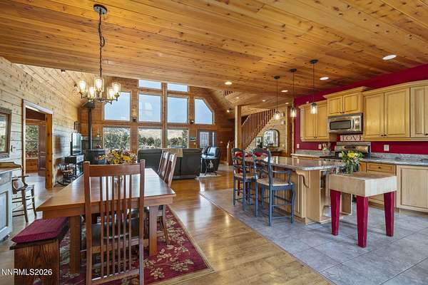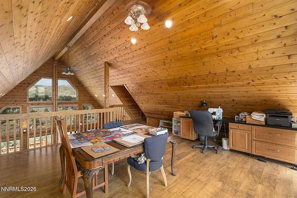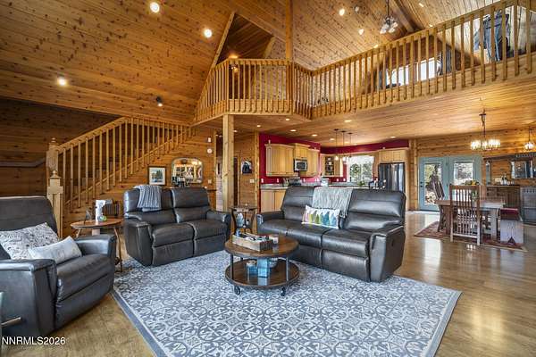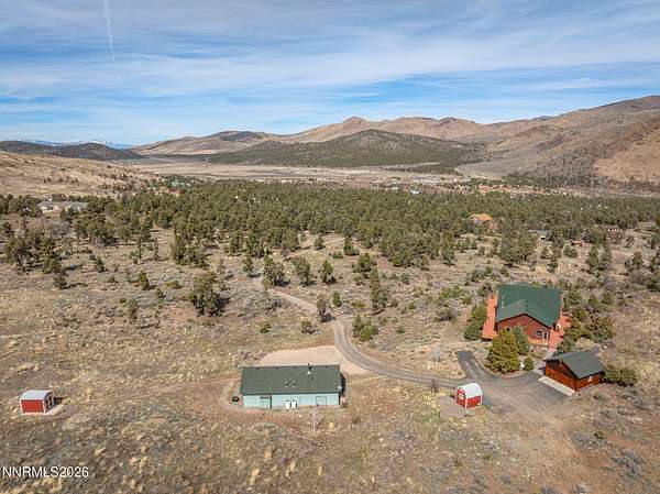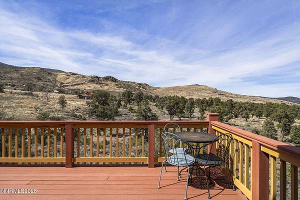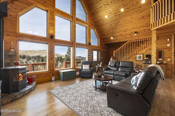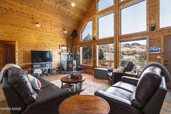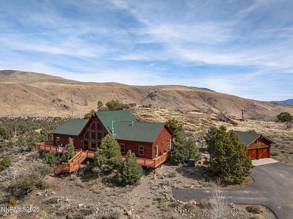 Leave the pace of California behind and settle into wide open skies, quiet hillsides, and unforgettable Carson Valley sunsets. Tucked into the peaceful hills of Pine Valley, this charming cedar home sits on more than 10 private acres, offering the space, privacy, and freedom many buyers are searching for in Northern Nevada. Inside, soaring ceilings and a dramatic wall of windows fill the great room with natural light and sweeping valley views. Warm cedar walls, an open kitchen with granite countertops and a large island, and a cozy pellet stove create an inviting space to relax or gather with family and friends. Step outside onto the wraparound deck - perfect for morning coffee, fresh mountain air, and evenings spent watching the sun set across the valley. With a detached garage, large workshop, RV hookups, and no CCRs, this property offers the flexibility to live, explore, and truly enjoy the Carson Valley lifestyle.