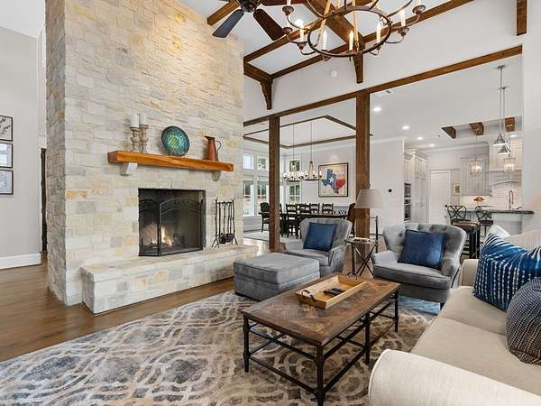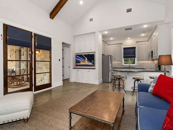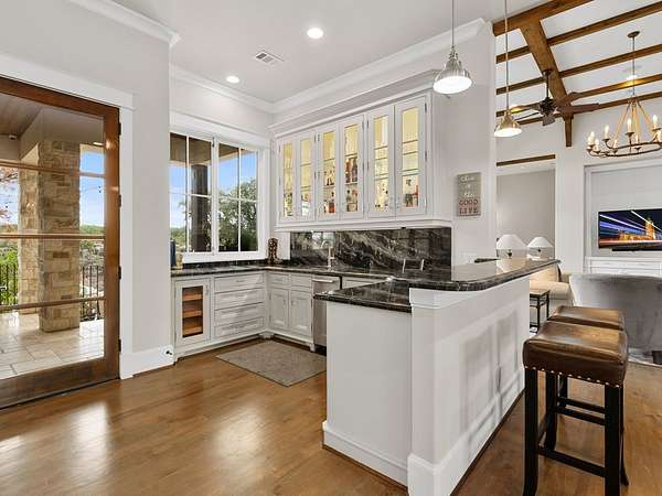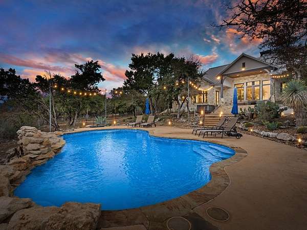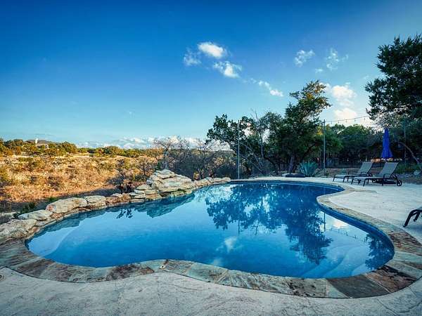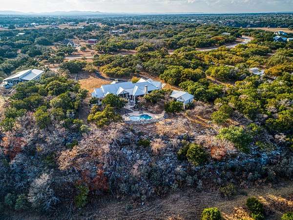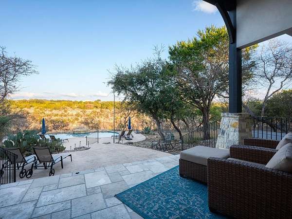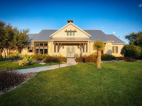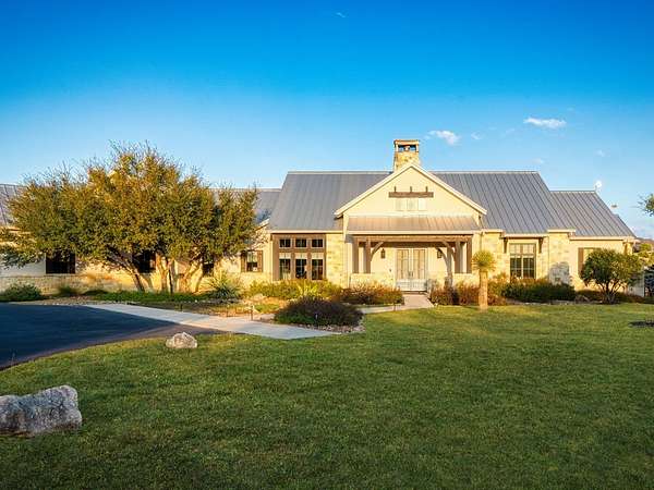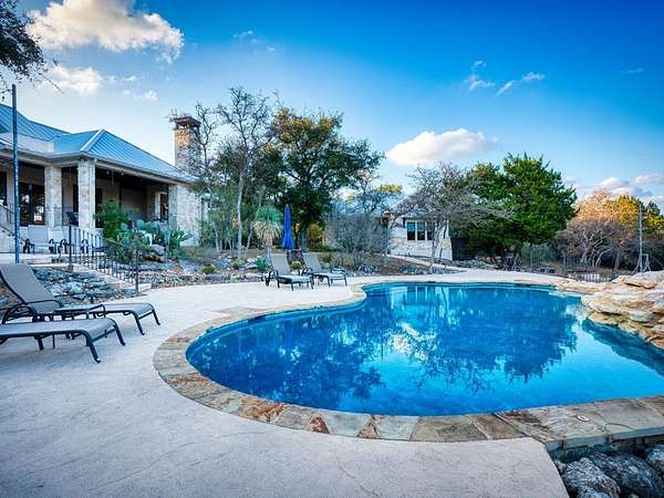 This Hill Country Masterpiece sits on 3.63 acres on a bluff forty feet above the Medina River with 3 bedrooms, 2 full baths and 2 half baths. The 872 sq ft Casita has an additional large bedroom and full bath. (Not included in sq ft of house) Enter the home's foyer featuring an eighteen foot ceiling and stone wall floor to ceiling. The home centers around a great room with a fourteen foot high beamed ceiling and fireplace with a view of the pool and river bluff. One side of the home features a large primary bedroom with vaulted beamed ceiling, large primary bath with ceiling treatment including a whirlpool tub, large shower, access to the outdoor shower, walk in closet with marble island, a dressing table and a separate storage room that also has access to the home office. Also off the foyer is the formal powder room and study. Back to the great room to view an open area that includes dining room with ceiling treatment, island kitchen with lots of storage and a separate bar with sit down counter. Bar has an under counter wine refrigerator and ice maker. Walk through the kitchen to the rear hall to find a bedroom with ensuite bath, secondary powder room, pantry and utility room.