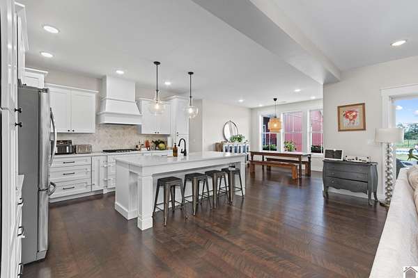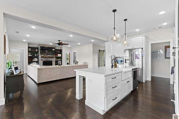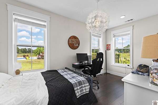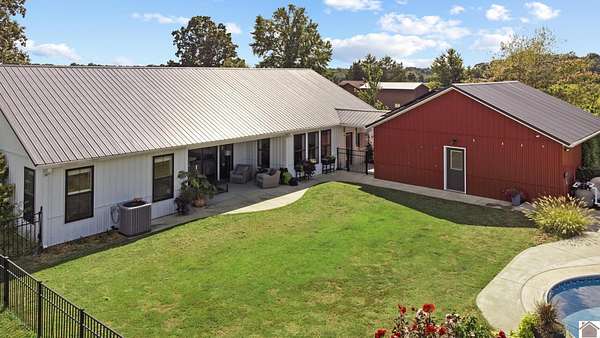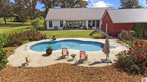 Beautifully crafted farmhouse-style home, built in 2018, offers the perfect blend of rustic charm and modern convenience. Located on 3.58 acres, this home features a welcoming front porch and in-ground pool perfect for relaxing or entertaining. Inside, the open-concept layout boasts wide-plank hardwood floors that enhance the farmhouse aesthetic. The spacious kitchen features a large center island, farmhouse sink, quartz countertops, pantry with coffee bar and stainless steel appliances--ideal for everyday living. Thoughtfully designed with comfort in mind, the home includes a primary suite with a spa-like ensuite bath, complete with a soaking tub, double vanity and separate shower. Additional bedrooms offer ample space, while a mudroom, laundry room, and home office add functionality. Large windows throughout bring in natural light, while neutral tones, brick fireplace and sliding barn doors add to the authentic farmhouse feel.