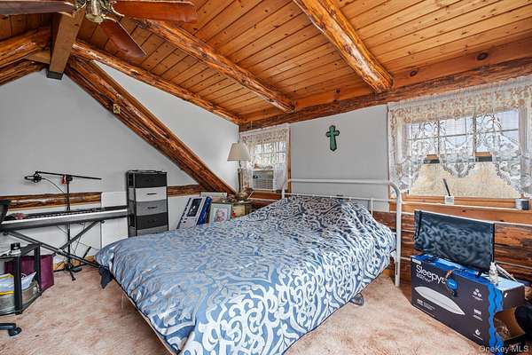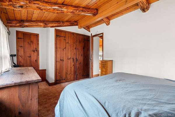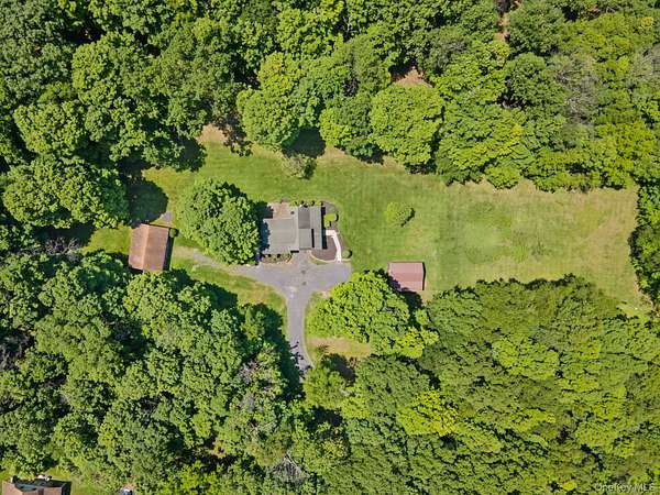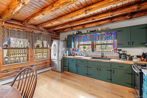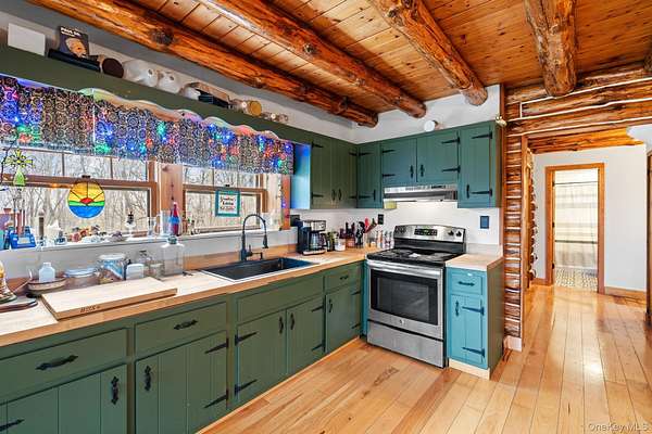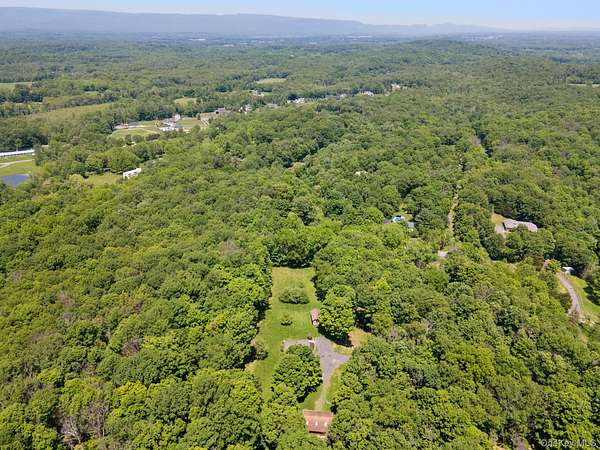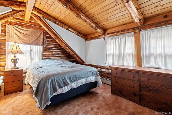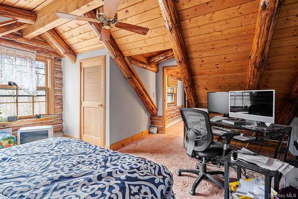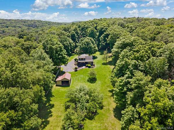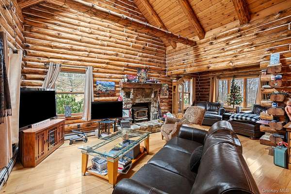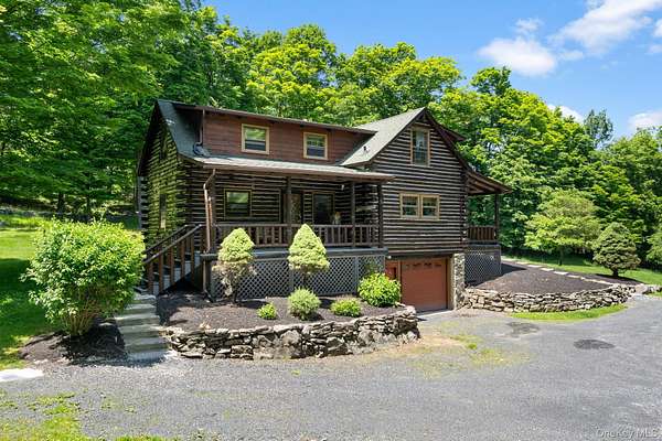 TOWN OF CRAWFORD LOG HOME SITUATED ON 25+ ACRES OF SERENE WOODED LAND. This charming 3-bedroom, 2-bathroom log home is situated in the Town of Crawford, within the Pine Bush School District. Conveniently located just 10-15 minutes from local restaurants, shopping centers, and essential services such as banking and postal facilities, this home offers both comfort and accessibility. Surrounded by nature, it is near several parks, including the Crawford Walking Trail and Winding Hills County Park. Major highways, including Route 17K, Route 302, and Interstate 84, provide easy access to Orange County Airport and Stewart International Airport, making travel and commuting effortless. The location is just the start check out the amenities this home has to offer starting with the kitchen combining classic craftsmanship with contemporary convenience. Deep green cabinetry with black iron hardware is complemented by butcher block style countertops, offering both style and function. A farmhouse sink sits beneath a row of large windows, allowing natural light to fill the space while providing a view of the surrounding trees. Exposed log beams and wood-paneled ceilings add to the warm, rustic aesthetic, while stainless steel appliances integrate modern practicality. The open-concept living and dining areas highlight the home's impressive architecture. Vaulted ceilings with exposed log rafters create an airy, spacious feel, while large windows frame the natural scenery. The dining space sits beneath a classic chandelier, while the adjacent living area is anchored by a floor-to-ceiling stone fireplace, complete with a wood-burning stove. The natural wood flooring enhances the seamless flow between spaces, emphasizing the home's log cabin character. The main level bathroom features a modern-rustic blend of design elements, including a sleek vanity with matte black fixtures, a bold patterned tile floor, and a tiled shower with classic subway tile detailing. Upstairs, the lofted ceilings continue into the bedrooms, where exposed log beams create a distinctive, cozy atmosphere. Large windows allow for ample natural light, while the combination of wood and neutral-toned walls maintains a balanced aesthetic. Plush carpeting provides warmth underfoot, and built-in storage adds functionality to the space. The second bathroom reflects a refined yet rustic style, featuring a modern black vanity, a crisp white sink, and a walk-in shower with elegant marble-patterned tile. The contrast between the wood ceiling and the contemporary finishes gives the space a refined yet cohesive look. The property extends to an expansive backyard, bordered by mature trees for privacy and natural beauty. A secondary outbuilding offers additional storage, workspace options or an additional two car garage. The peaceful setting, combined with the home's well-crafted details and thoughtful updates, makes this property a timeless retreat. This will not last long on the market, don't delay, call now for your showing!!!