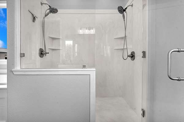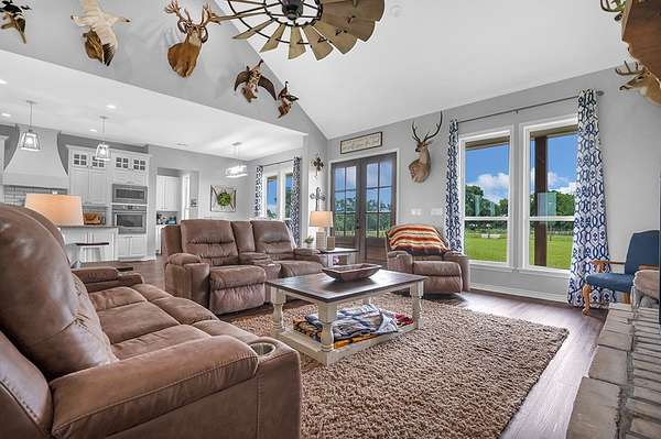 - Blinds, Ceiling Fan(s), Kitchen Island, Open Floorplan, Pantry, Pot Filler, Primary-Lower Level, Split Bedrooms, Vaulted Ceiling(s)
