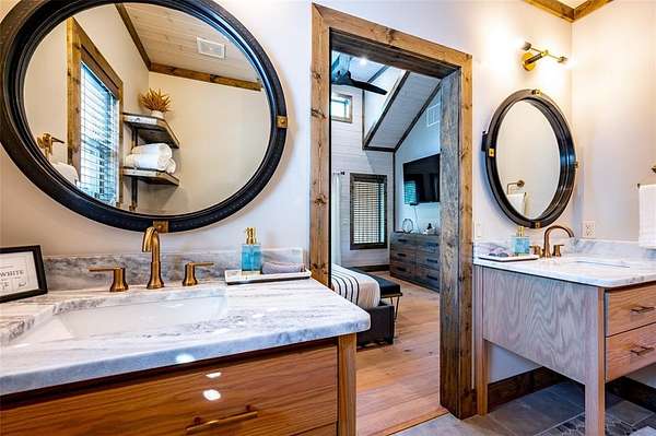 Welcome to The Steinmore, a luxurious 5-bedroom, 5.5-bath cabin located 0.5 mile off HWY 259 and less than 1 mile from Choctaw Landing. This cabin sleeps 14 guests in beds, this spacious retreat is ideal for large families, groups, or those seeking an indulgent escape. As you step inside, the impressive living room captures attention with its floor-to-ceiling stacked stone fireplace, large windows that frame the breathtaking natural views, and an open-concept design that invites conversation and relaxation. The expansive dining area features a table seating up to 10, plus an additional 6 at the island, creating the perfect space for gathering. The kitchen boasts stainless steel appliances, a gas range, and marble countertops. Entertainment options abound with a main floor game room equipped with a ski ball, air hockey, a TV, and a wet bar featuring a commercial-grade ice machine. For added convenience, a nearby half bath ensures ease of access. All 5 bedrooms have private ensuites, offering comfort and privacy. On the main level, you'll find the main suite with a king-sized bed, private deck access, and a spa-like master bath with a soaking tub, walk-in shower. 2 additional bedrooms on this floor include another king-sized room with an ensuite featuring a walk-in tile shower, and a bunk room that sleeps 6 with queen-over-queen beds and twin-over-twin built-in bunks, along with a private bath. The upper-level houses two additional suites, each with a king-sized bed, TV, and private full bath. These rooms are connected by a catwalk and offer access to a private covered balcony where you can enjoy the serenity of the outdoors. Outside, enjoy 3,400 SqFt of deck space, including a marble outdoor kitchen with a gas grill, dining for 16, outdoor gas fireplace, and a TV. Relax in the NEW hot tub on a private deck or sit around the fire pit under the stars. Take a look at the video tour and reach out for details.