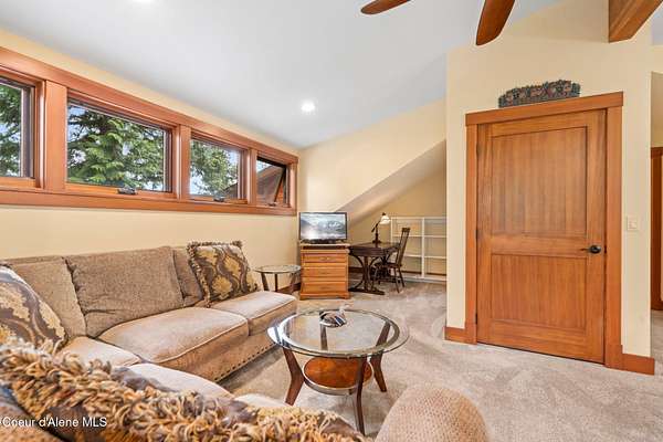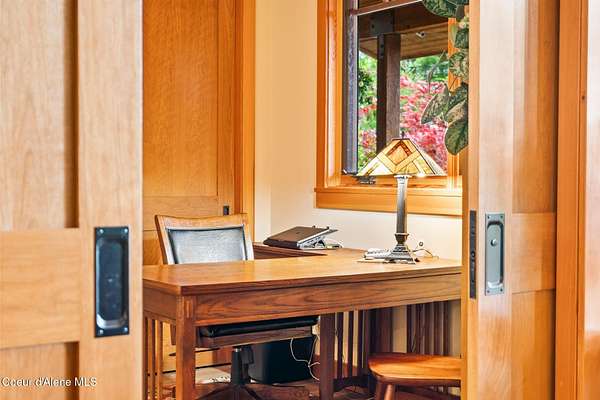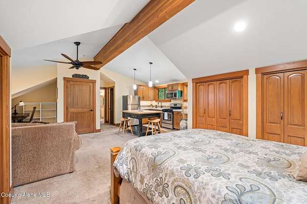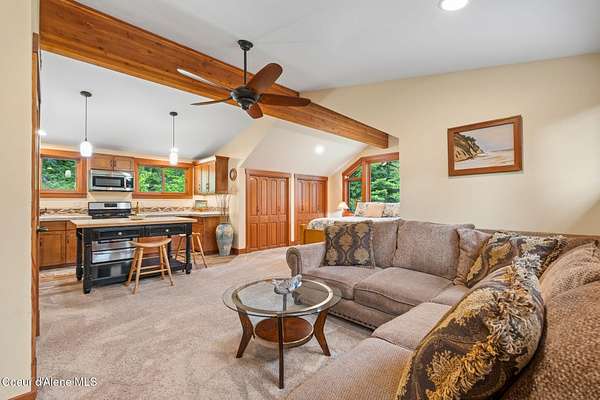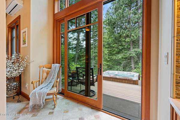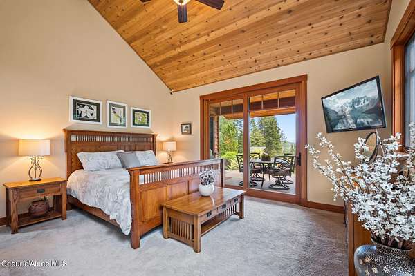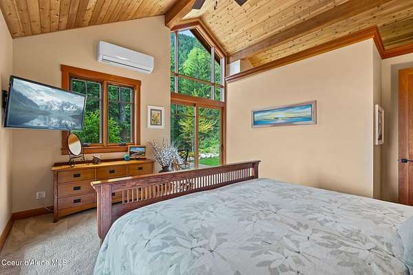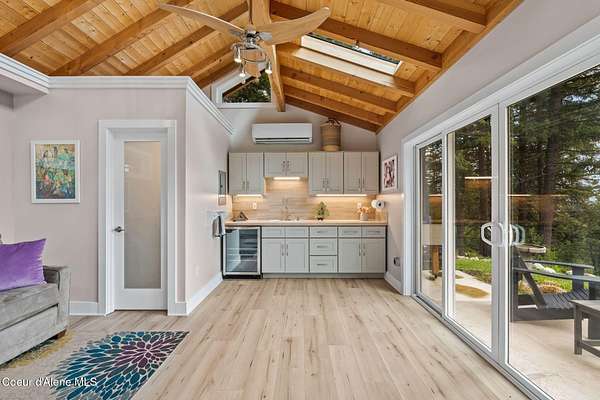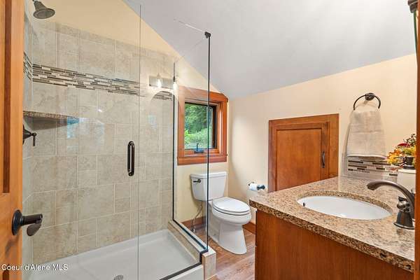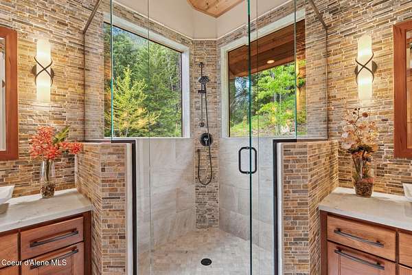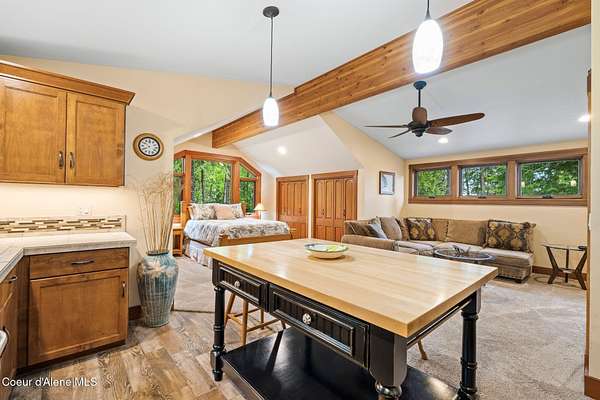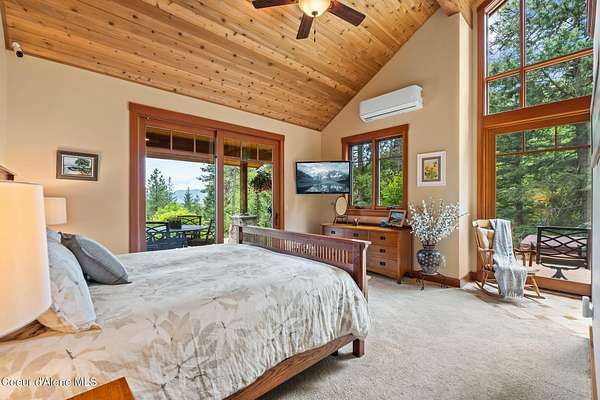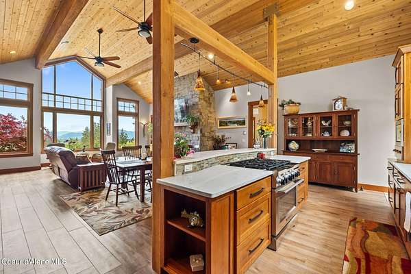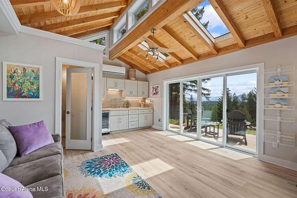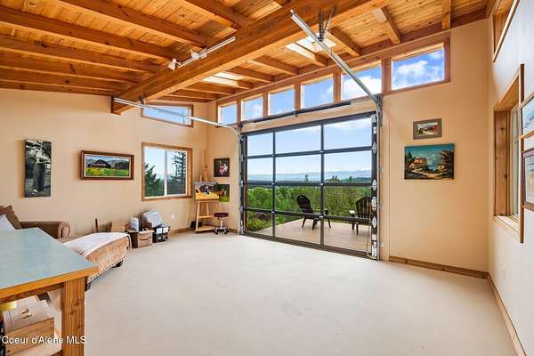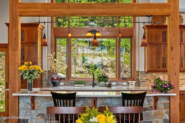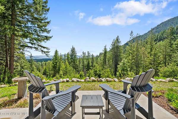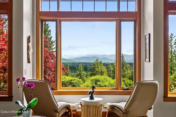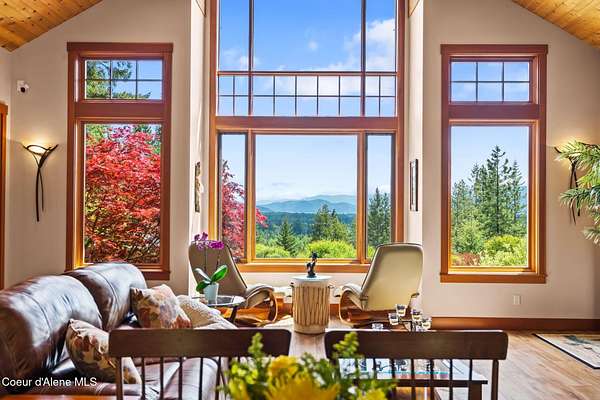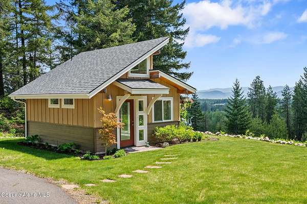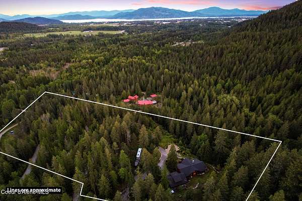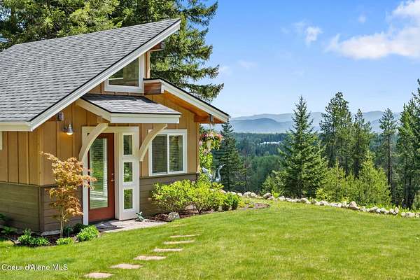 Meticulously constructed and artfully nestled into the foothills below Schweitzer Mountain, this exceptional property offers a rare blend of luxury, comfort, and natural beauty. With sweeping views of the surrounding mountains and the sparkling lake beyond, this home is a true haven for those seeking serenity, space, and inspired design. Bathed in abundant sunshine and softened by gentle mountain breezes, the home welcomes each day with stunning sunrises and a chorus of native wildlife. This 7.93-acre property is dotted with huckleberry bushes and thoughtfully landscaped with deer-resistant shrubs and perennials, providing a low-maintenance yet vibrant outdoor living experience. Inside, an open floorplan showcases exquisite craftsmanship, from exposed cedar beams, soaring tongue-and-groove ceiling to wide plank, wood grain tile flooring. Floor-to-ceiling windows frame breathtaking views and flood the home with natural light, while radiant in-floor heating keeps every space warm and inviting. The full masonry gas fireplace, clad in real stone veneer, anchors the great room with timeless mountain elegance. The gourmet kitchen is a chef's dream, featuring ivory quartz countertops, a contemporary stone backsplash, high-end appliances and ample storage. The primary suite is a true retreat, with private access to two outdoor spaces, including a secluded deck with hot tub overlooking tranquil Schweitzer Creek. The en-suite bath is filled with natural light and finished with quartz countertops and heated travertine floors. Additional living spaces include a beautifully appointed 700 SF guest studio above the garage with a separate entrance, full kitchen, and bathperfect for multi-generational living or guest accommodations. Two detached 320 SF custom studio spaces expand the property's versatility. One features a kitchenette and bathroom, ideal for a home office, art studio, or guest quarters. The other is an off-grid escape overlooking the peaceful Selle Valley, offering unmatched privacy and inspiration. Whether you're taking in the views or enjoying a peaceful stroll down to Schweitzer Creek, this one-of-a-kind mountain sanctuary offers not only a place to livebut a way of life.