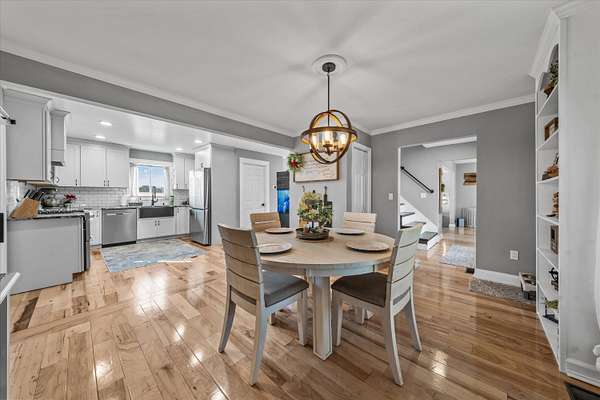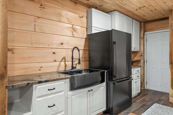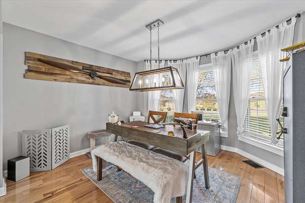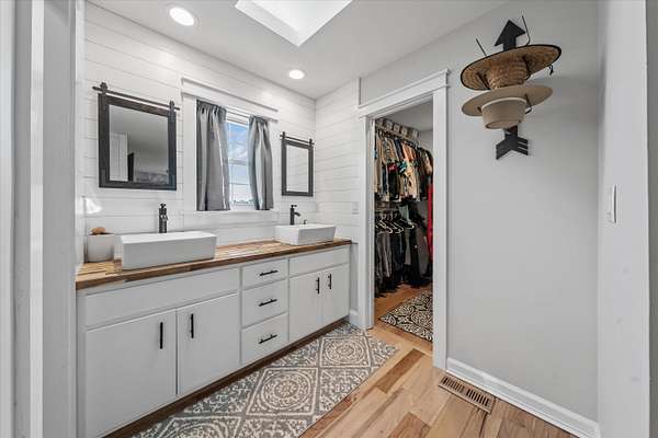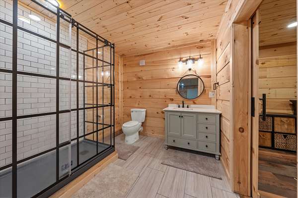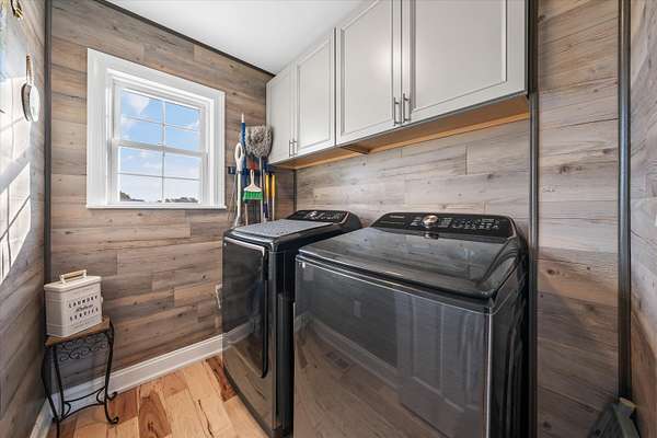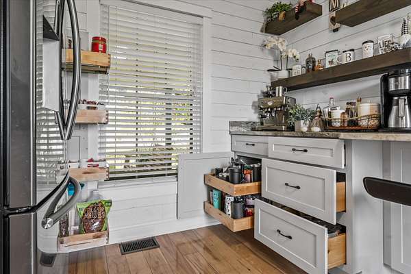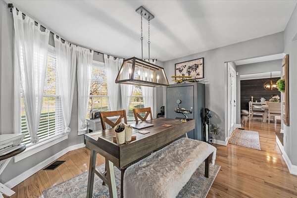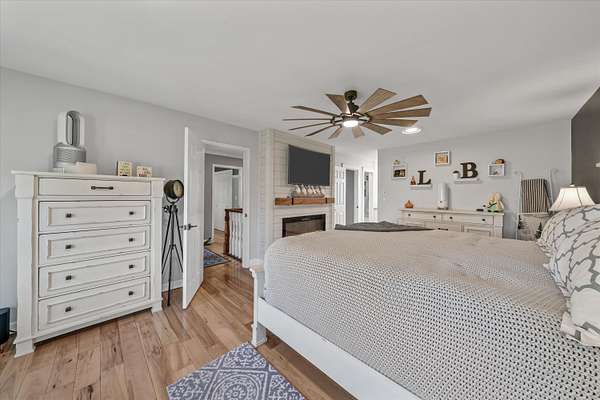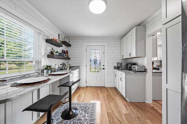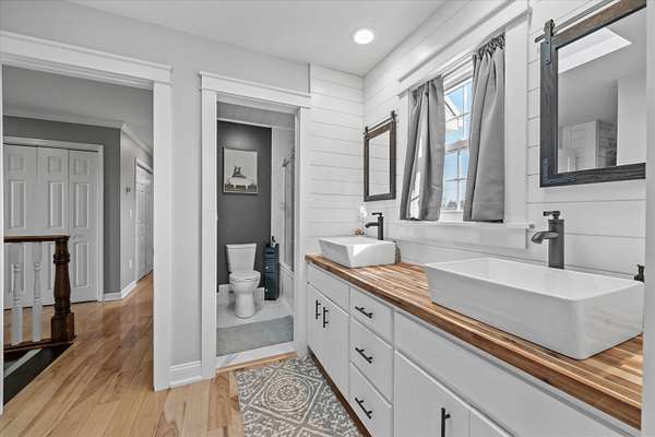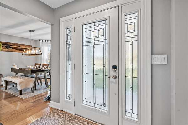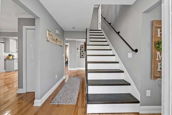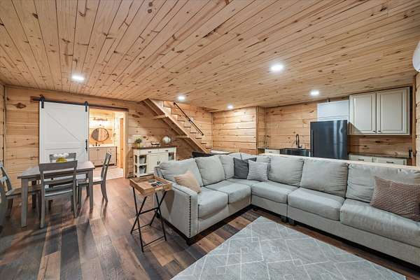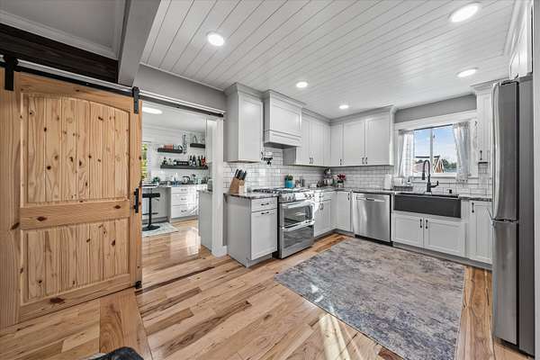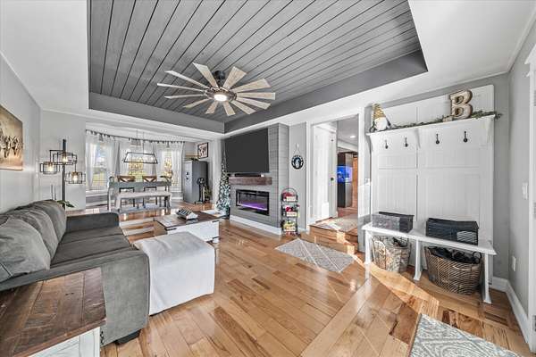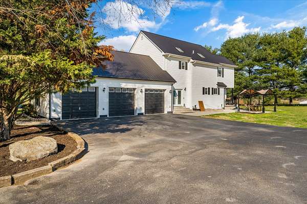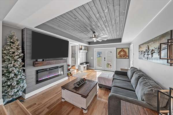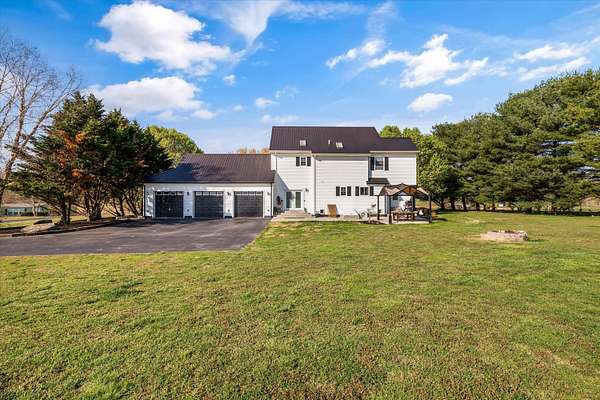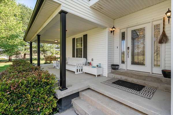 Set on a peaceful, flat two-acre homesite with no restrictions, this beautifully crafted two-story home with a finished basement offers privacy, flexibility, and character just one mile from the lake. A welcoming covered front porch with a swing overlooks scenic pasture, a pond, and cattle--perfect for slowing down and enjoying the setting. Inside, the redesigned main level features hickory oak flooring throughout the main and upper levels, tongue-and-groove ceilings, shiplap accents, and crown molding. The kitchen showcases custom dovetail cabinetry, granite countertops, a farmhouse sink, gas range with pot filler, and stainless appliances. A former dining room now serves as a butler's pantry with added cabinetry, granite counters, wood shelving, and a secondary fridge. The open layout flows into a flexible dining and living space, with a sunken living room featuring a tray ceiling, wood details, and an electric fireplace. A half bath and spacious laundry room complete the main level. Upstairs offers a split-bedroom layout with a private primary suite featuring bay windows, an electric fireplace, spa-like bath with dual vessel sinks, tiled shower, and walk-in closet. Two additional bedrooms share a well-designed hall bath, and a Juliet balcony adds charm off the landing. The fully finished basement lives like a second home with a cozy cabin feel, kitchenette, living and dining areas, full bath, additional bedroom/flex space, and separate entrance--ideal for guests, multi-generational living, or rental income. Additional highlights include a three-car back-load garage with oversized doors, EV charging, new HVAC for the upper level, and a tankless water heater. Outdoors, enjoy unrestricted land with an invisible fence, partial wire fencing, a commercial-grade chicken coop with automatic water, gazebo, and hot water hose access.