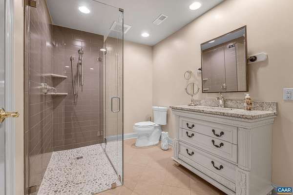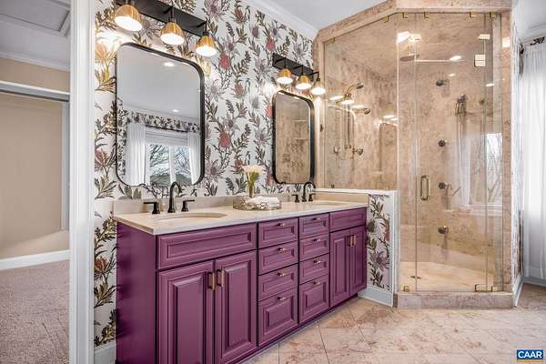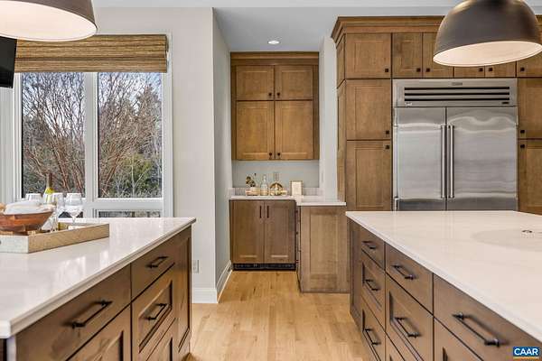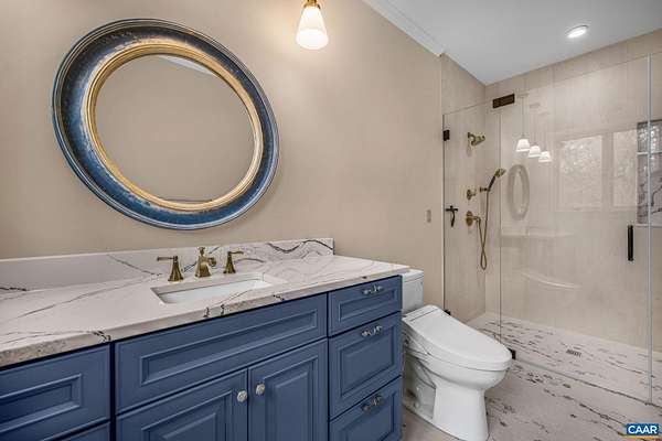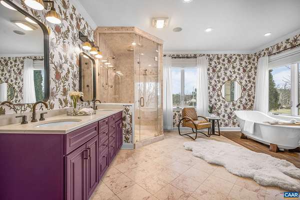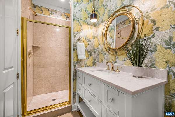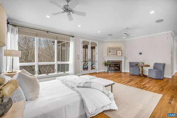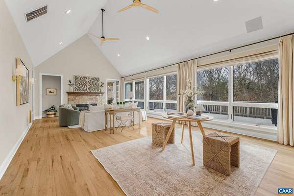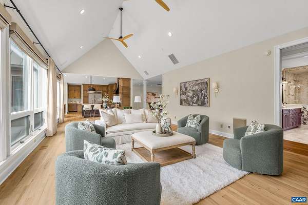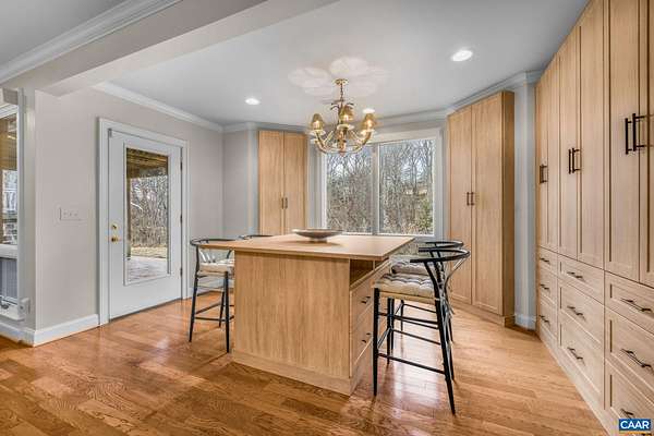 Set on nearly 4 peaceful, gated acres just minutes from town, Keswick, local vineyards, and renowned restaurants, this private retreat is designed for effortless main-level living. The heart of the home is the stunning, renovated chef's kitchen, featuring double islands, abundant cabinetry, luxury appliances, beverage drawers, and thoughtful details throughout--ideal for gathering and entertaining. The kitchen opens to a light-filled family room with a stone fireplace and access to the serene back deck and screened porch, perfect for taking in the quiet natural setting. The main-level primary suite is a true sanctuary, boasting a spa-like bathroom with a freestanding tub, a custom enclosed shower/steam room and full size stackable washer/dryer. Two additional bedrooms, two full baths, and a spacious mud/laundry room complete the main level. A three-car garage adds convenience. The walk-out lower level includes a living area and flex space with built-ins, a private guest suite with full bath, a fitness area, and a second kitchen area, perfect for multigenerational living or long-term guests. Ample unfinished storage space and a 4th garage bay provide plenty of storage. Purchasers eligible for a 25% discount to the Club at Glenmore.