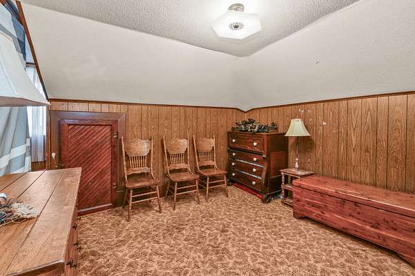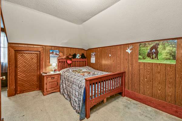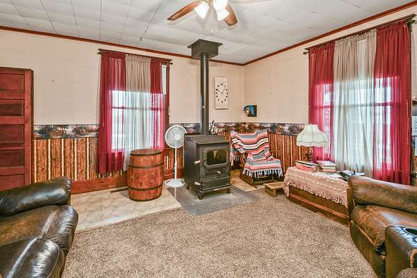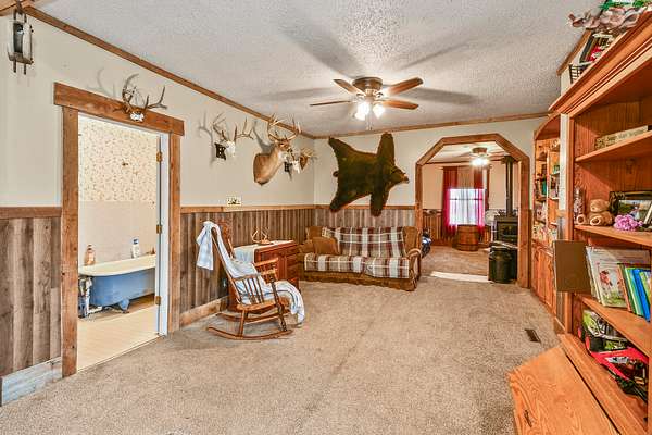 The main level includes a master bedroom, office, living room with wood stove, and bonus room. Upstairs offers two bedrooms, a playroom, and full bath. Exterior features durable metal siding and peaceful country surroundings.
