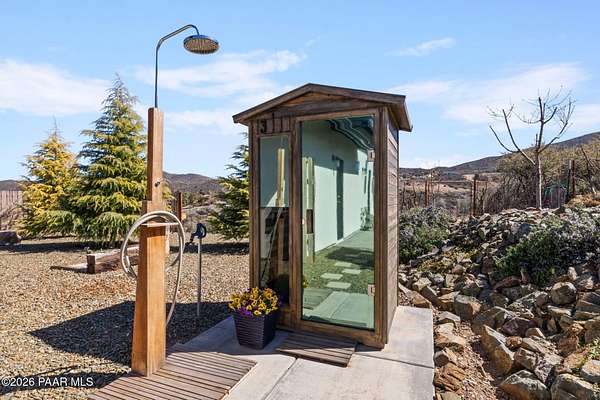 You won't believe it until you see it! Welcome to this beautifully designed 1830 sq ft home where sophistication meets comfort. Featuring soaring 12 foot ceilings, this open concept layout creates a bright and airy feel throughout. The gourmet kitchen is truly the heart of the home. Thoughtfully designed with premium finishes, generous counter space and stunning details perfect for entertaining. Also including a private sauna and outside shower for your own health retreat.Every corner reflects exceptional attention to detail, from the carefully selected finishes to the unique architecture accents that set this home apart. Guests have their own private guesthouse and can enjoy our beautiful Arizona sunsets while taking a stroll on the walking path along the entire property. The solar is owned and grid tied creating credits with APS. A perfect blend of style, function and character. This is elevated living at its finest.