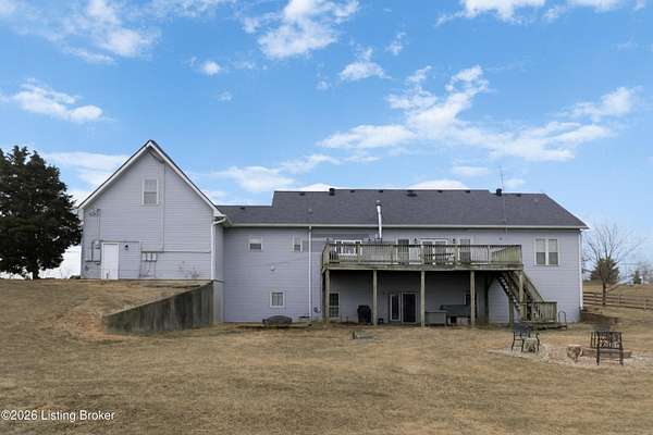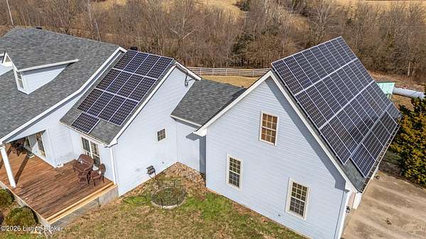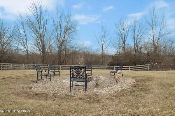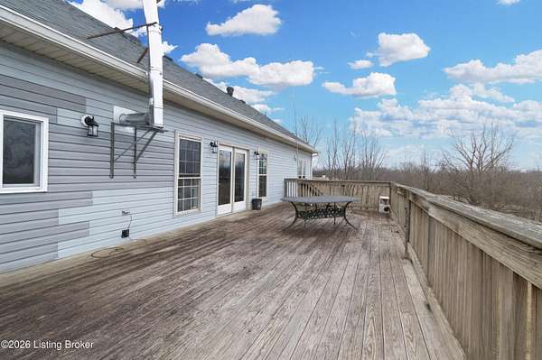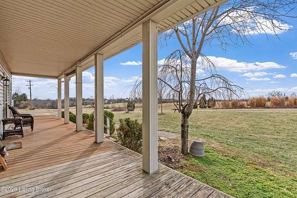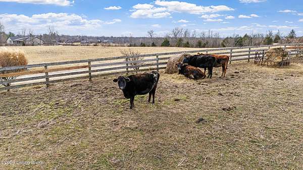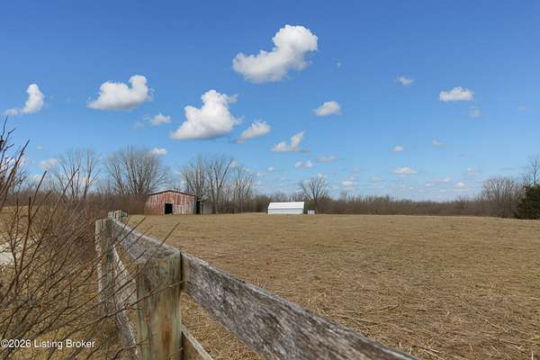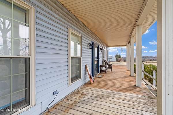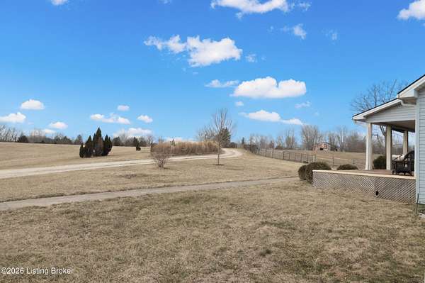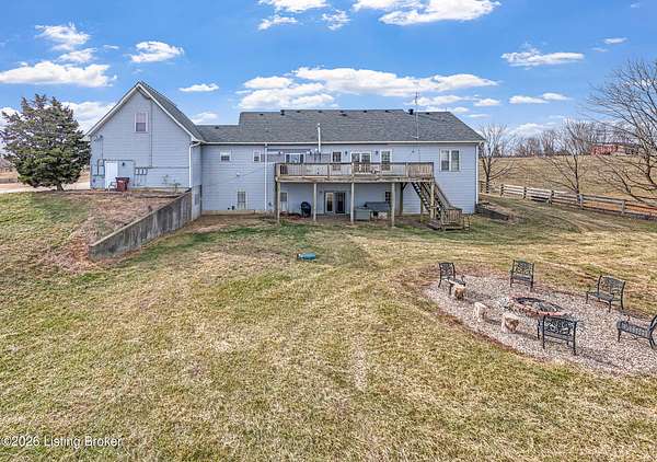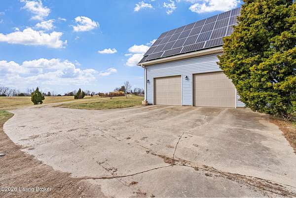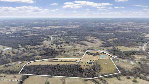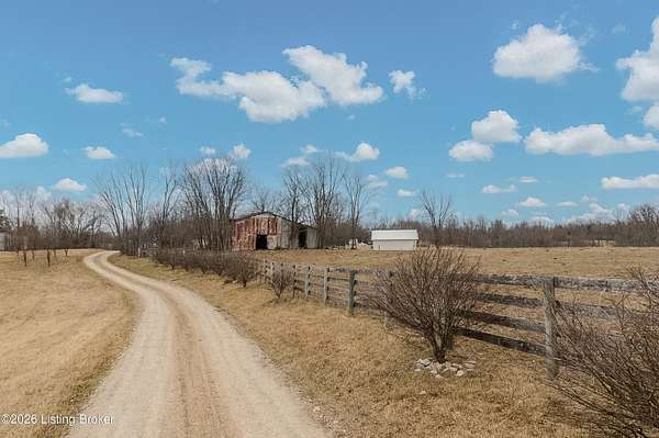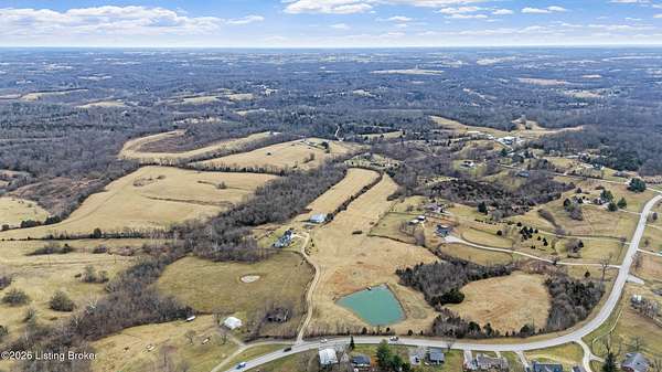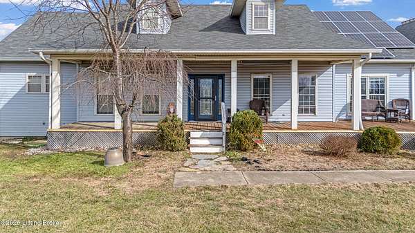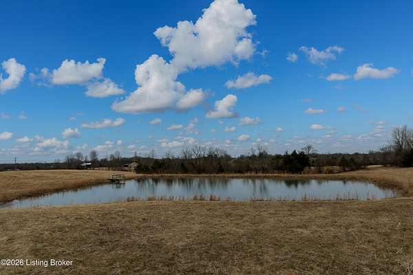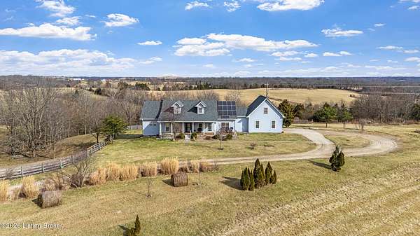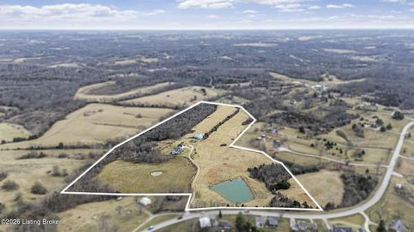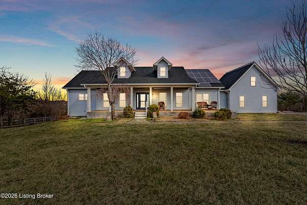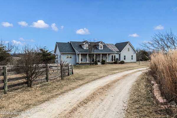 This exceptional cape cod style walkout ranch on over 33 acres offers far more than you ever expected-and everything you didn't know you needed. With over 4200 square feet of finished living space, this five-bedroom, three-full-bath home is thoughtfully designed for both everyday living and large gatherings. Energy efficiency is a standout feature, with geothermal heating and solar panels significantly reducing utility costs. A covered front porch welcomes you inside, where an open-concept family room and dining area flow seamlessly into the kitchen-ideal for entertaining. Built-in bookcases frame the media center in the family room, adding both function and charm. Off the family room is a deck that extends the length of the home, perfect for the amazing views overlooking the back 33 acres. A first-floor bedroom with dual access offers excellent flexibility and is well-suited for in-law living or accessibility needs. The primary suite is a private retreat featuring a spacious walk-in closet and an en-suite bath with separate double vanities. A third first-floor bedroom is tucked away, generously sized for oversized furniture, and offers peaceful views of the front acreage. A full bath on the main level connects to an oversized laundry and mudroom with exceptional storage. The walkout lower level is equally impressive, featuring a massive second family room with windows overlooking the rear of the property and direct access to a private patio. This space easily accommodates a dining area, media room, exercise space, or all three. Two additional bedrooms, each with walk-in closets, and a full bath complete the finished lower level. Storage is abundant throughout the home, including a second large pantry near the stairwell, two distinct unfinished basement spaces, oversized bedroom closets, and extensive mudroom storage. The garage offers ample room for vehicles and equipment, plus a substantial walk-up attic for even more storage. The land itself is extraordinary: a former cattle pasture, a fishing pond at the entrance, a large outbuilding, former chicken coop, garden areas, and wooded acreageoffering endless possibilities for recreation, farming, or simply enjoying wide-open space. The 33 acres are complemented by an additional 5-acre parcel, deeded separately and available for purchase independently. Conveniently located just minutes from the highway and across from the entrance to the prestigious L'Esprit Estates, this ranch-style Cape Cod combines privacy, efficiency, and scale in a truly rare offering. All of this is ideally situated just off the I-71 corridor, right on the border of Oldham and Henry Countiesprivacy, convenience, and versatility in one remarkable property.