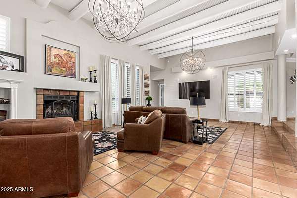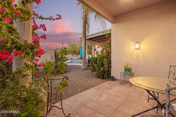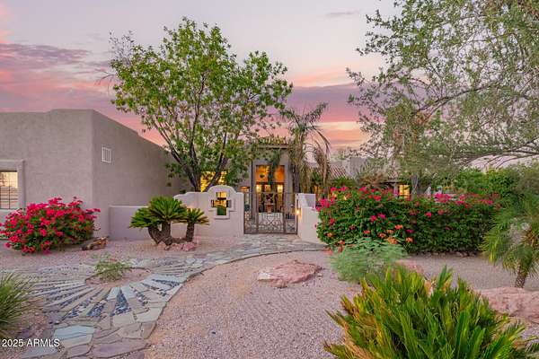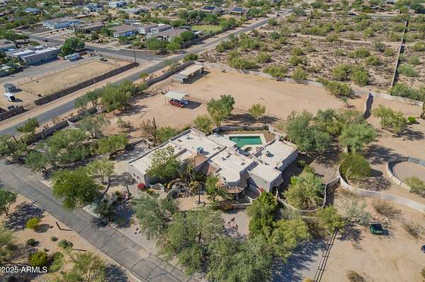 HORSES POOL GATED CUSTOM Quintessential Arizona living in this custom 4,008 sq ft single-level home on 2.2 acres with horse stall and arena. Recently remodeled 3 beds, 3.5 baths, and stunning saltillo tile floors, this home blends Southwest charm with modern updates. The gourmet kitchen offers Viking appliances, quartz counters, and abundant cabinetry, opening to spacious living areas with beamed ceilings, fireplaces, and a wet bar. Step outside to a private resort-style backyard with sparkling pool, spa and shaded patio. Property includes 3-stall barn, turnout, arena space, and direct access to riding trails. Located in a gated community near Scottsdale Rd & Dynamite, this home offers privacy, space, and luxury-perfect for entertaining or peaceful desert living. Donkey not included.