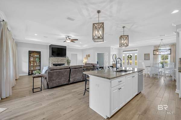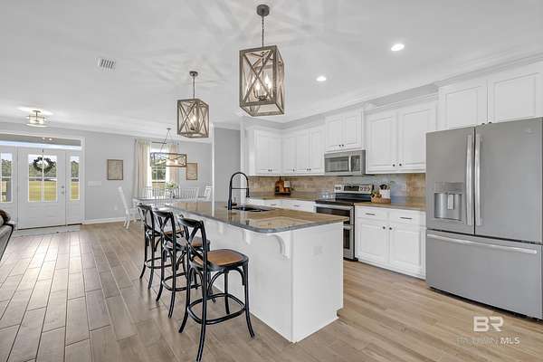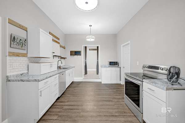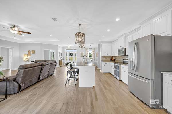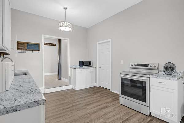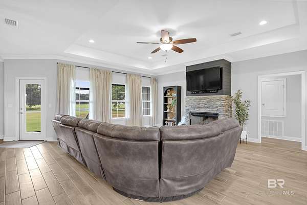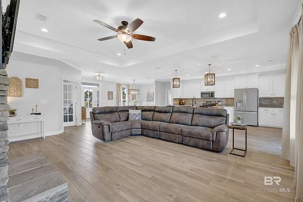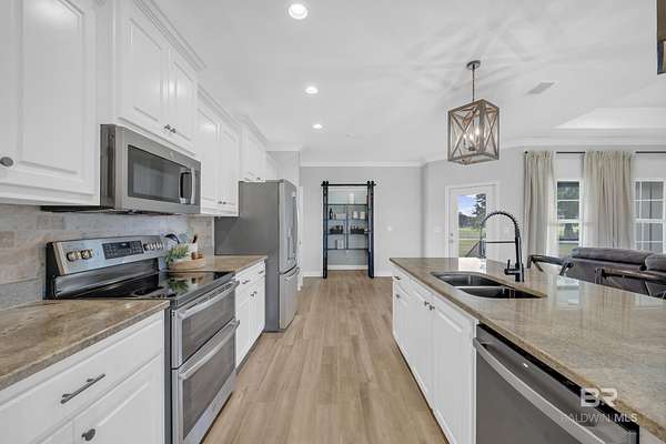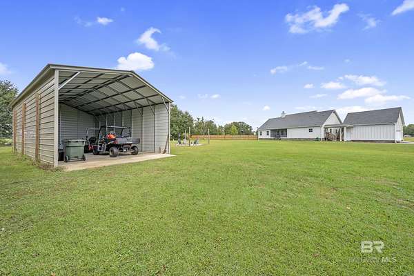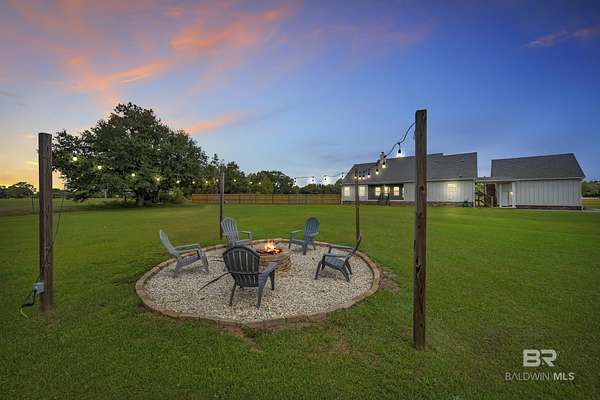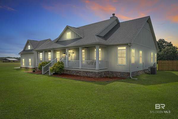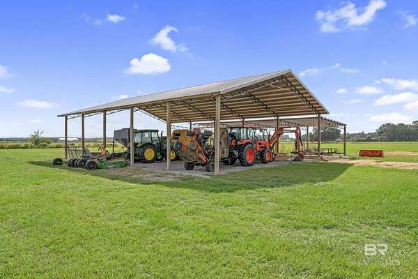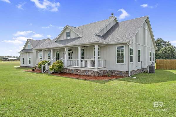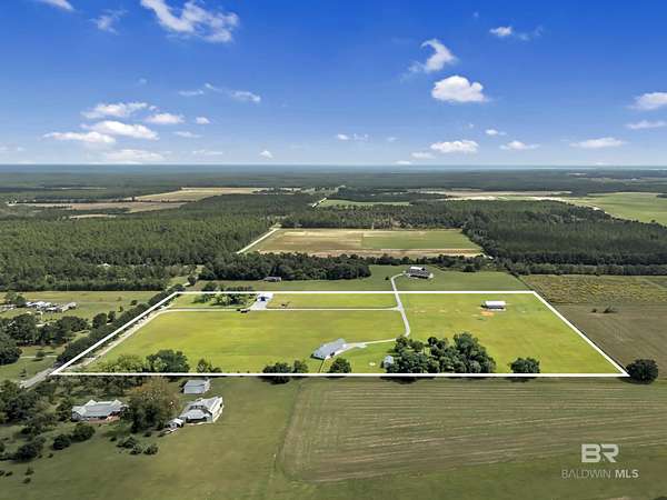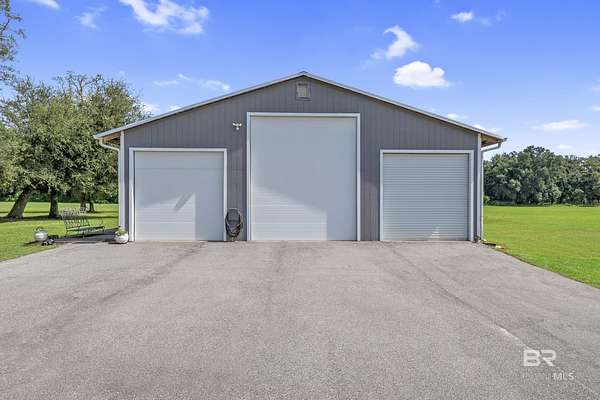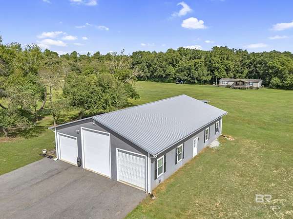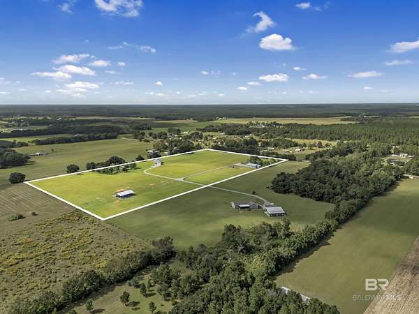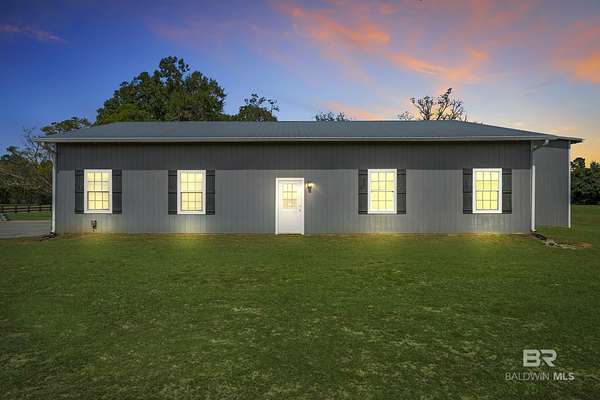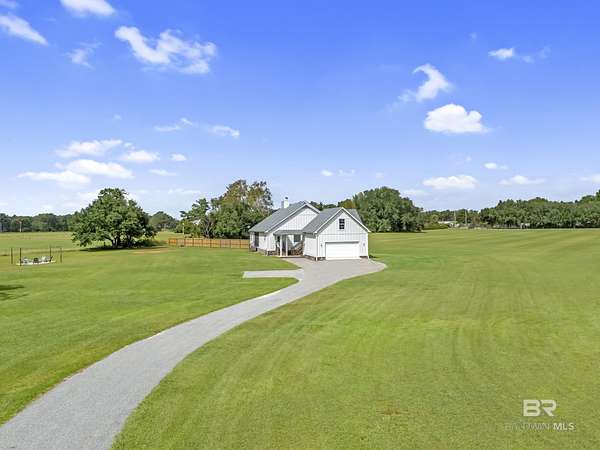 Introducing a private, 21 acre retreat located in quaint Elberta, a farming community just minutes from the beaches of the Alabama Gulf Coast. Featuring a gated entrance and paved drive, this property boasts a beautifully crafted home built in 2019 by Bass Homes, with an attached 2 car garage and potential for additional square footage on the second floor! Inside this 2,210 sf home, you'll discover a kitchen fit for a chef, with large island that is open to the living area and exquisite stone fireplace, making this floor plan ideal for gatherings and entertaining. Three bedrooms plus an office and two baths round out this stunning build which features 360 degree views of the vast homestead. The primary suite is truly a must see with double vanity and spacious custom shower. Porches front and rear capitalize on the incredible views. Adjacent to the home is a fire pit area along with a three sided metal building, with height suited for RV storage. Towards the rear of the property you'll find a 40 x 60 pole barn with gravel base, suited for storing equipment. Also on site is a 40 x 60 barndominium constructed in 2017 featuring a multitude of shop space and well suited living quarters including one bedroom, one bath, living and kitchen space. The shop space has height capability to store an RV and features three roll up doors total, providing the ability to optimize storage solutions. You'll discover endless possibilities with this versatile property and with close proximity to schools, beaches, dining, entertainment and shopping, the location cannot be beat! Adjacent parcel with MLS #386596 also available for purchase separately. Buyer to verify all information during due diligence.