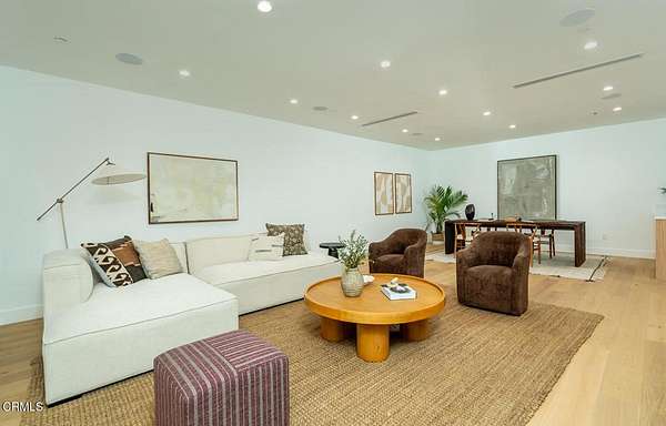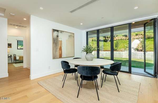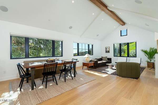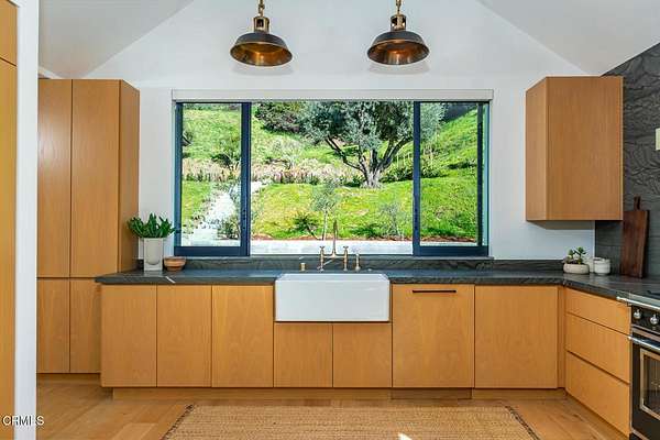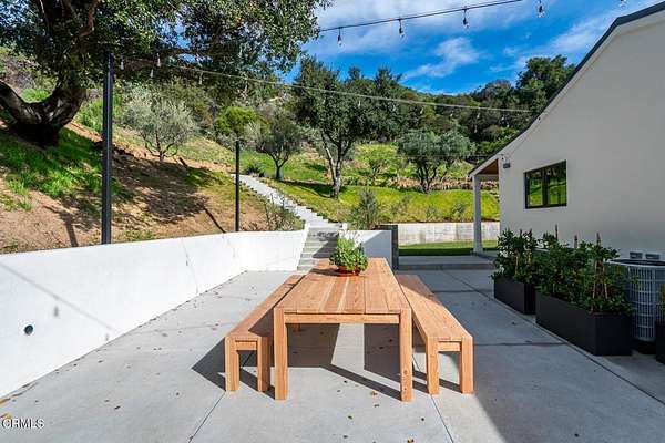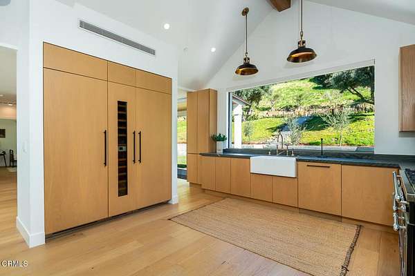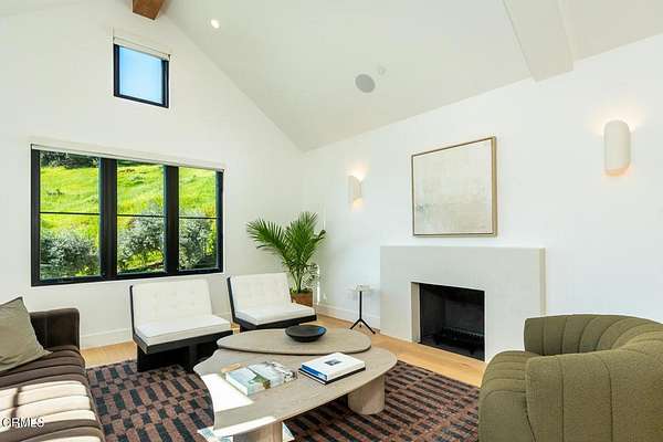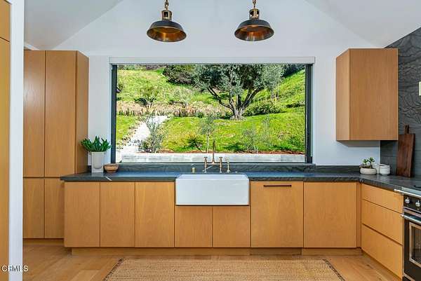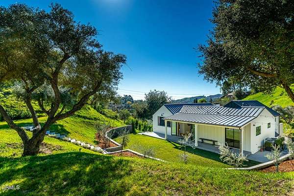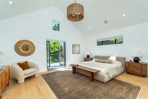 This elegantly redesigned Sonoma style farmhouse residence offers four bedrooms and five beautifully appointed bathrooms, blending timeless architecture with refined modern living. Thoughtfully designed interiors feature wide-plank white oak flooring and exceptional finishes throughout, creating a warm yet sophisticated atmosphere. Every space has been curated with attention to detail, from the gracious living areas to the serene bedroom suites, delivering both comfort and understated luxury. Designed for both everyday living and gracious entertaining, the home seamlessly blends classic farmhouse charm with contemporary luxury. Located at the end of a cul-de-sac with a gated perimeter this home offers over 4.5 acres of privacy, studded with mature olives trees and views of DTLA.