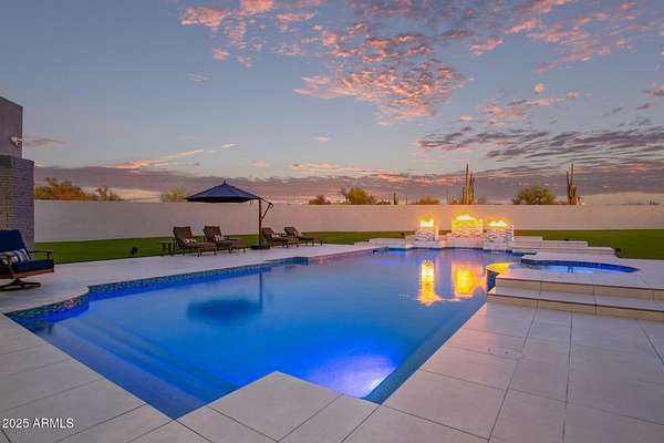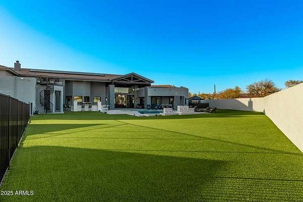 This impeccably designed custom estate seamlessly blends modern luxury with resort-style living. Set on a private 2.3-acre compound with no HOA, this masterpiece offers an unparalleled lifestyle. Priced under recent appraised value. From the moment you arrive, soaring exposed wood beam ceilings extend from the grand portico through the main living areas and out to the expansive back patio. Recently redesigned with contemporary elegance, this meticulously maintained home is move-in ready and perfectly positioned to capture Arizona's breathtaking sunsets, sparkling city lights, and majestic mountain views. Equipped with Tesla Powerwall units and owned solar panels, this estate is as energy-efficient as it is beautiful. Freshly painted inside and out, the home features brand-new tile fl and Restoration Hardware lighting, all seamlessly integrated with Control4 smart home automation. The gourmet kitchen is a chef's dream, boasting top-of-the-line built-in appliances, a gas cooktop with a custom hood, double ovens, a veggie prep sink, and new textured marble countertops, a sleek backsplash and under-cabinet accent lighting. The primary suite is a luxurious retreat, offering a cozy sitting area with a fireplace, 18ft ceilings, a completely redesigned spa-like bathroom, a custom walk-in closet, and a large refinished sauna. The backyard has been transformed into an entertainer's paradise with a private viewing deck to take in the stunning surroundings, extensive landscape lighting, lush turf, and a fully remodeled pool with expansive new tile decking. A brand-new outdoor kitchen, complete with a built-in BBQ, fridge, and sink, enhances the space, while fire bowls, a fire pit, and multiple seating areas create the perfect setting for outdoor gatherings. Plenty of room to add pickleball/sport court(s). The fully finished basement provides additional living and entertainment space, featuring a state-of-the-art movie theater, a full kitchen, a bonus/workout room, a bathroom, and a temperature-controlled 800-bottle wine cellar & tasting room. An oversized four-car garage with new epoxy floors, a reverse osmosis system, a water softener, and new tankless water heaters completes this exceptional home. Designed for the most discerning buyer, this estate offers the ultimate in luxury living. Pour a glass of wine, unwind, and experience the finest that Arizona has to offer. (Zoned for horses with room to add stalls, pen, etc..)