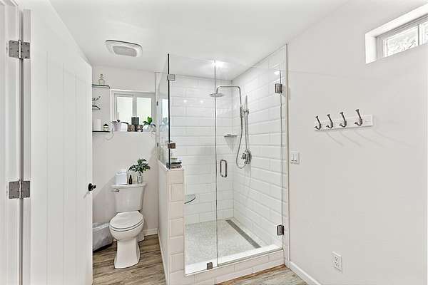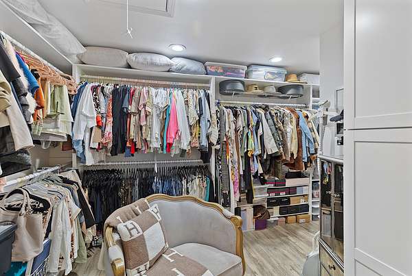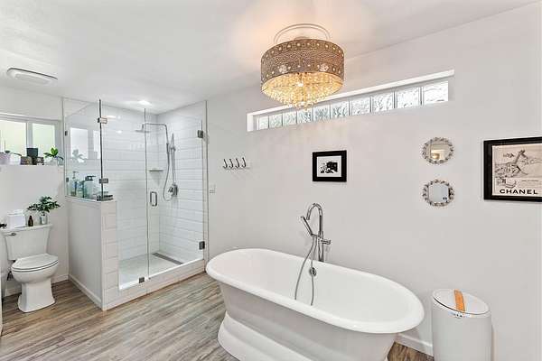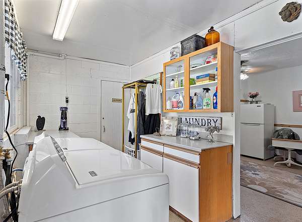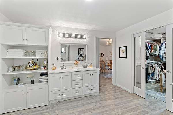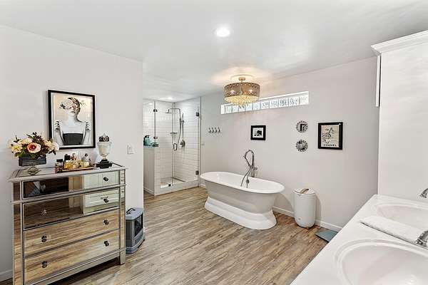 - Ceiling Fan(s), Double Vanity, In-Law Floorplan, Kitchen Island, Laminate Counters, Linen Closet, Primary Downstairs, Shower/Tub Combo, Soaking Tub, Solid Surface Counters, Tile Shower, Walk-In Closet(s)