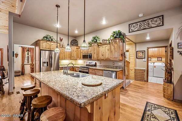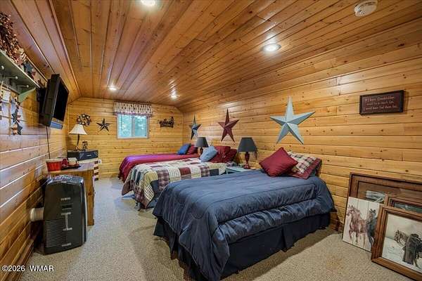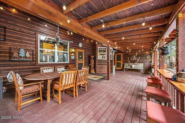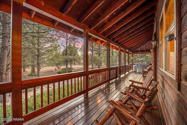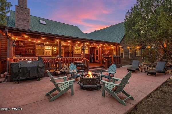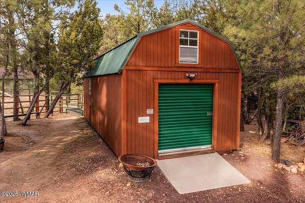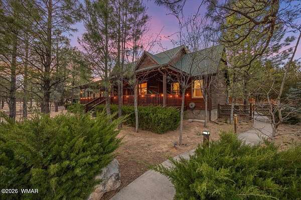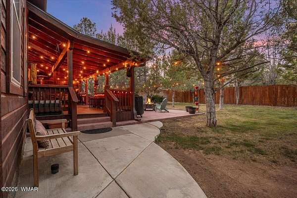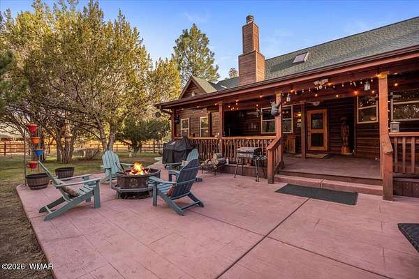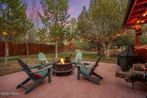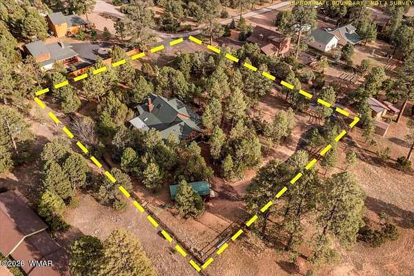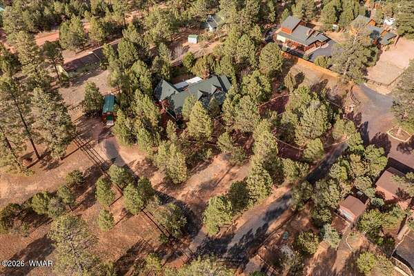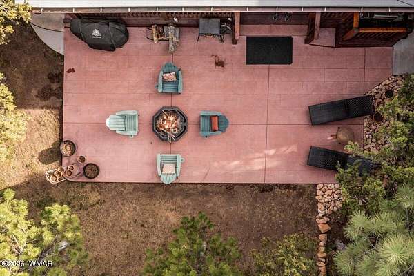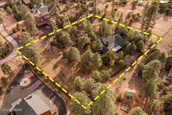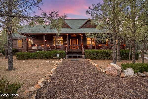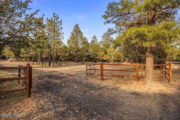 At approximately 6,612 feet elevation, this 3 bedroom, 2 bathroom home sits on 1.56 acres at the end of a cul-de-sac in a homes-only neighborhood. What sets this property apart is the privacy--set back in a quiet area surrounded by mature Ponderosa pines with frequent visits from deer and elk. Horses are allowed and there is no HOA. The home also features a new roof, adding value and peace of mind. As you enter, a dining room and office are located off to the right. The main living area offers vaulted pine ceilings, a wood-burning fireplace, and an open layout connecting the living room and kitchen. The kitchen is large, functional, and well laid out with granite countertops, updated appliances, ample cabinetry, and dual sinks. The primary suite is located on the main level and includes vaulted ceilings and a bathroom with dual sinks, a soaking tub, separate shower, and private toilet area. Upstairs provides additional space with a loft, offering flexibility for guests, office, or recreation. A vented skylight helps regulate temperature during warmer months. Exterior features include covered front and back decks with composite decking, a stamped concrete patio, and an in-ground fire pit. The backyard is fenced with a lawn area, garden space, and mature trees, making it suitable for pets. The entire parcel is enclosed with a three-rail fence and offers multiple access points. Additional improvements include a two-car attached garage and a 12x30 detached storage building with power, roll-up door, workbench, and loft storage. This property offers a quiet setting with space, functionality, and flexible living options.