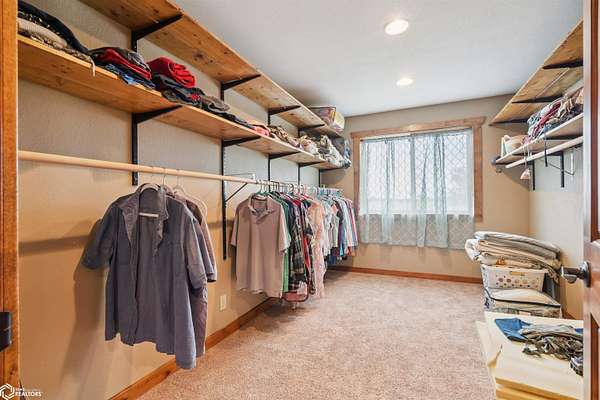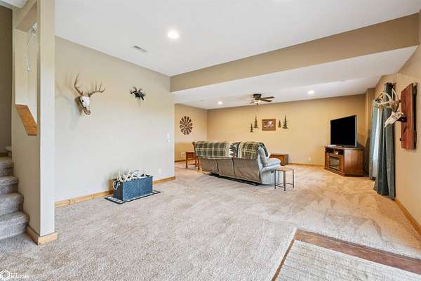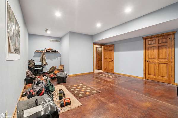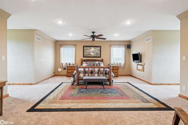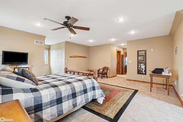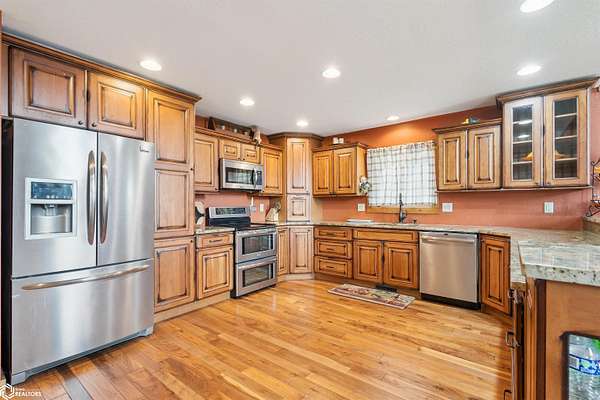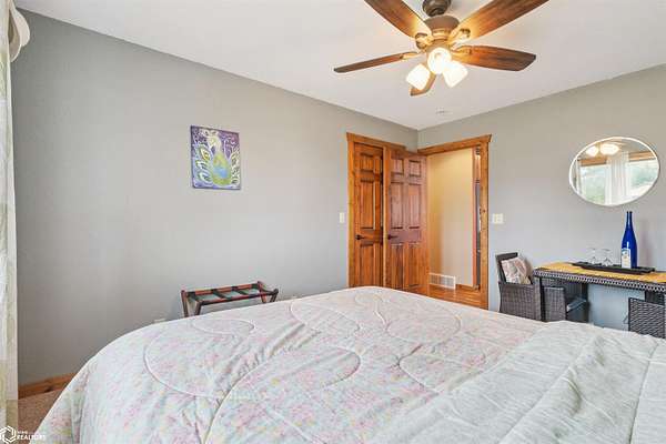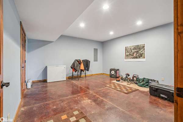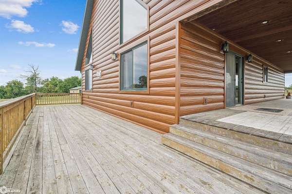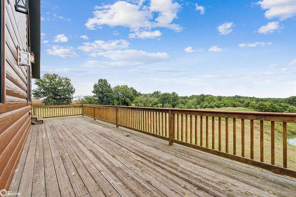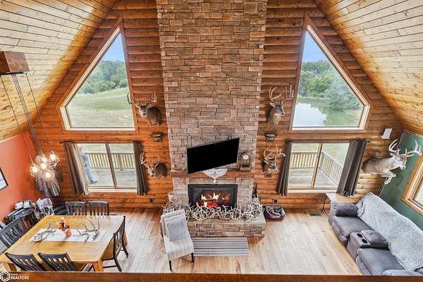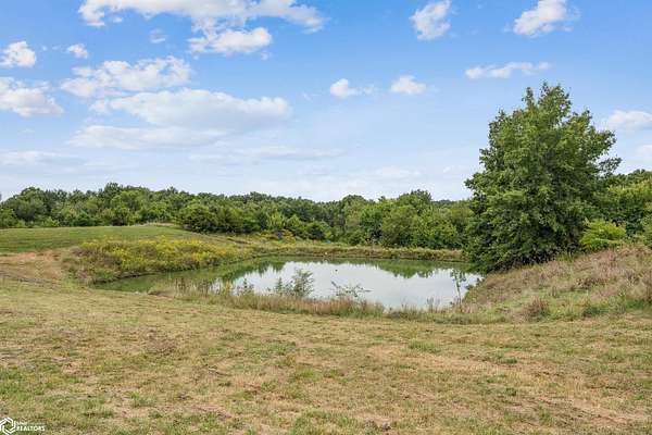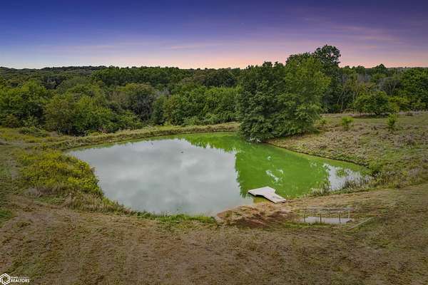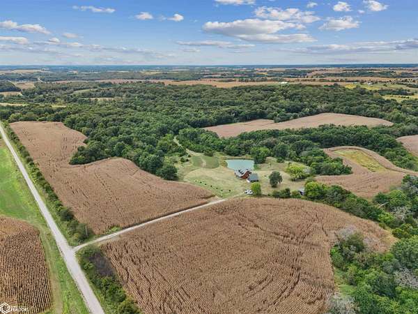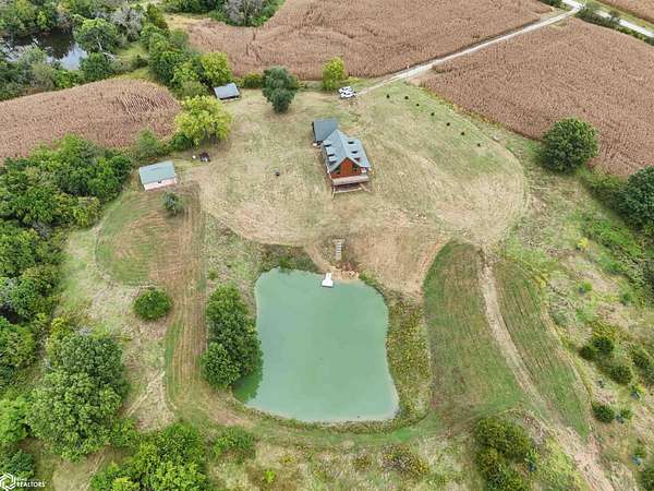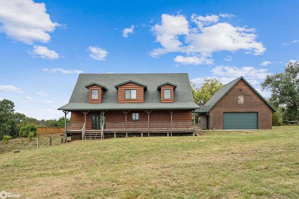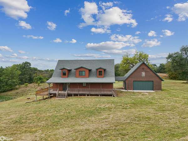 Discover the ultimate fusion of seclusion and sophistication in this exquisite custom-built residence. Tucked away on a private retreat amid Iowa's premier hunting grounds, this luxurious home offers unparalleled privacy in one of the state's most coveted natural settings. This stunning home features an open great room with soaring vaulted ceilings, abundant natural light from tall windows, and a custom stone fireplace as the focal point. Elegant walnut hardwood floors flow throughout, complemented by a gourmet kitchen boasting granite countertops, custom cherry cabinetry, and premium stainless steel appliances. The main level includes two spacious bedrooms with ample closets, a full bathroom, and a convenient mudroom/laundry area. Upstairs, the luxurious primary suite offers a generously sized bedroom with charming dormers, a spa-like bathroom with soaking tub and separate shower, and a large walk-in closet. The fully finished walk-out basement provides a cozy family room, a fourth nonconforming bedroom, a full bathroom, and a versatile bonus room ideal for a home gym or flex space. Heated & cooled with efficient geothermal heating/cooling, & spray foam insulation keeps the inside as comfortable as you desire. Exterior highlights include a welcoming full-length covered front porch, an expansive wood deck with breathtaking southern views overlooking the pond, and two detached two-car garages. ADDITIONAL LAND AVAILABLE