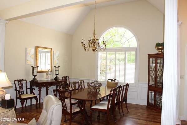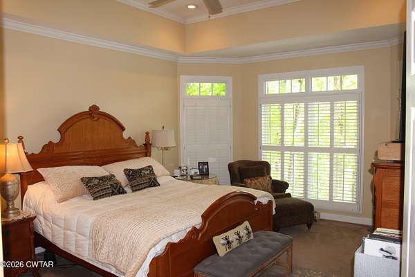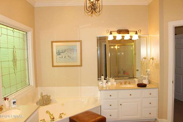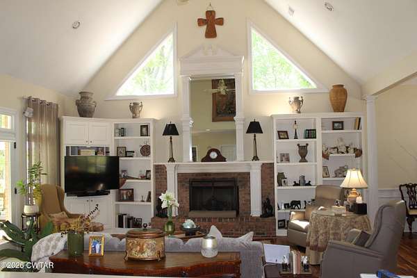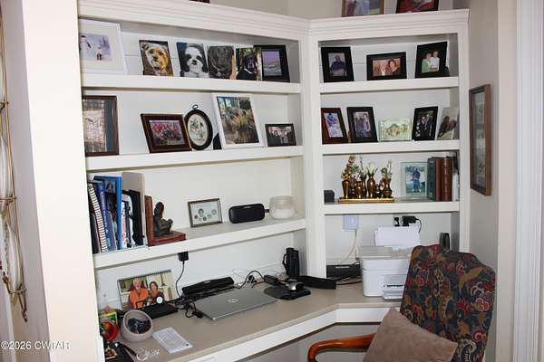 - Bookcases, Breakfast Bar, Cathedral Ceiling(s), Ceiling Fan(s), Central Vacuum, Crown Molding, Double Vanity, Eat-In Kitchen, Entrance Foyer, Fiber Glass Shower, High Ceilings, Open Floorplan, Pantry, Primary Downstairs, Tray Ceiling(s), Untextured Ceilings, Vaulted Ceiling(s), Walk-In Closet(s)
