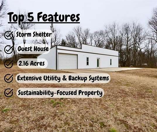So much more than just a house! Thoughtfully designed as a sustainability-focused home, this unique 2.16-acre property offers a 1,776 sq ft 3-bed, 2-bath main home plus a 900 sq ft, 1 bath guest house. Additional features include a chicken coop, fruit tree orchard, 12’x30’ workshop, and infrastructure already in place for a future greenhouse with drainage, electric, and water connections. Inside the main home, you’ll find newly installed granite countertops, new carpet, and a dual-fuel HVAC system. The guest house includes new flooring, its own garage, a newly installed mini-split system, propane hookup, and a handicap-accessible bathroom. Below the guest living space is an impressive 300 sq ft storm shelter and storage room. The workshop is fully equipped with electric, water, a root cellar, and a 1,500-gallon cistern. This back-up water storage, further enhances the property’s self-sufficient design. RV hook up too! This is a property that truly goes beyond what words can capture. Google Maps is not correct.