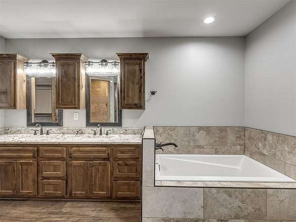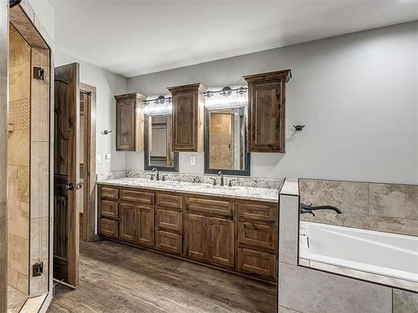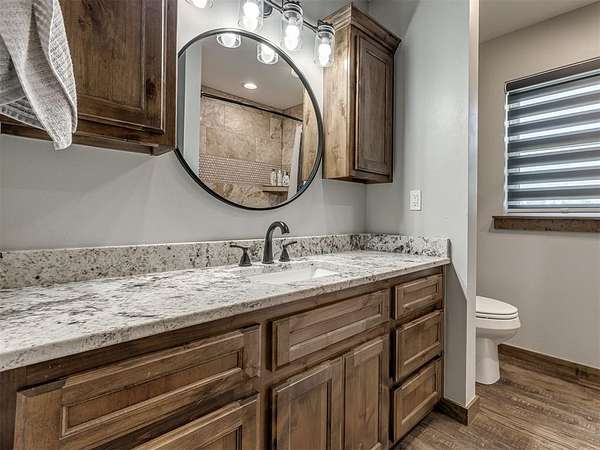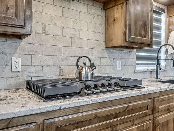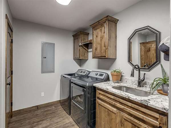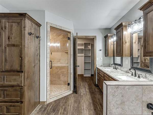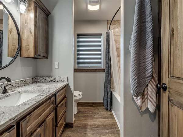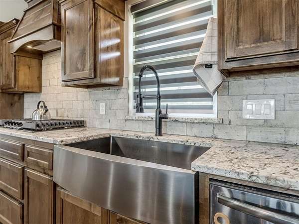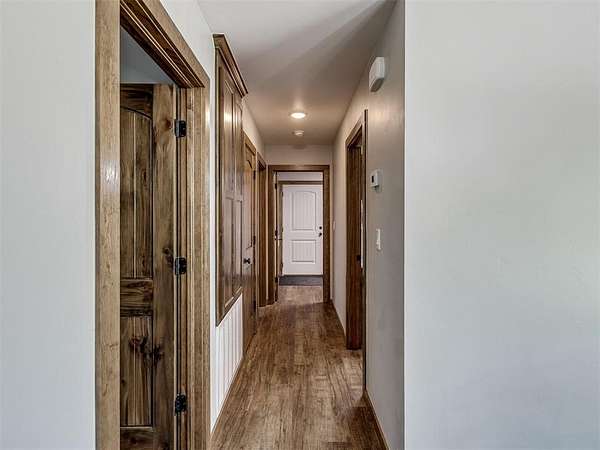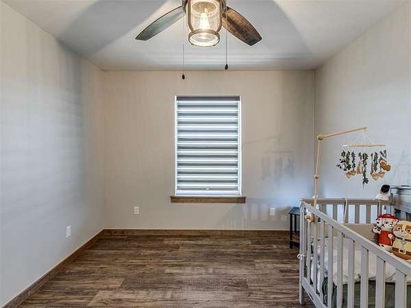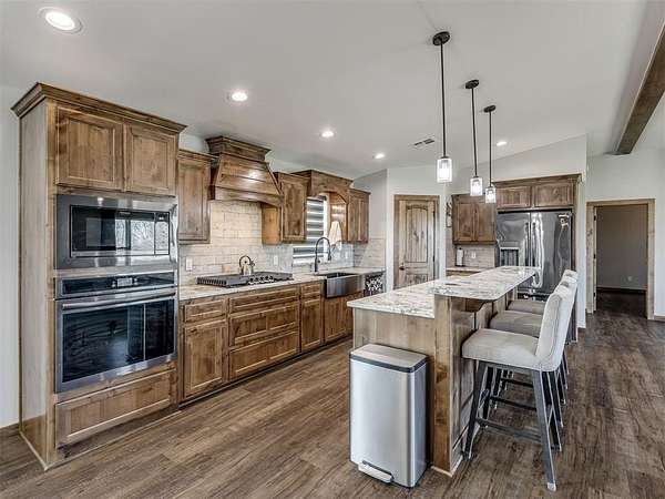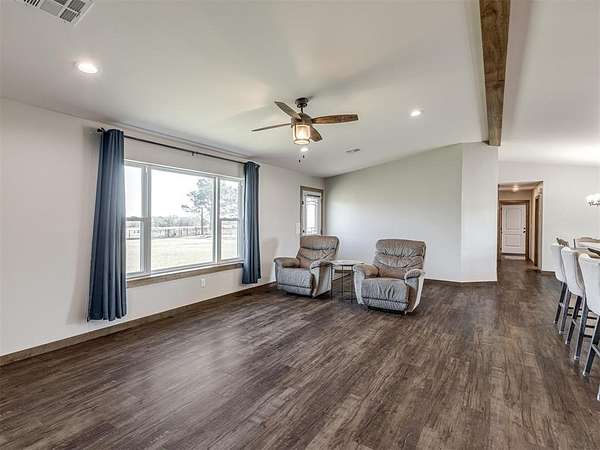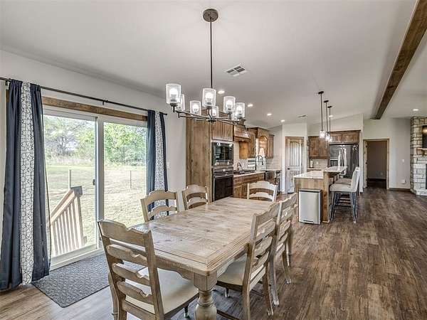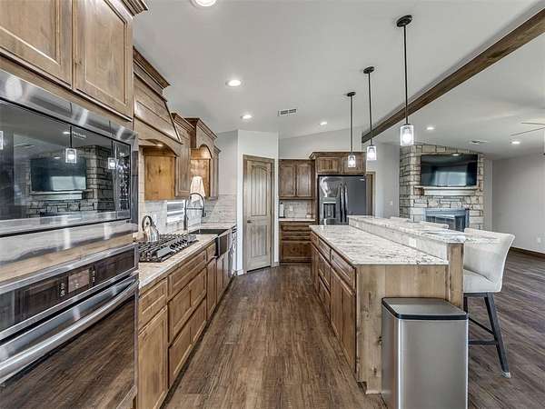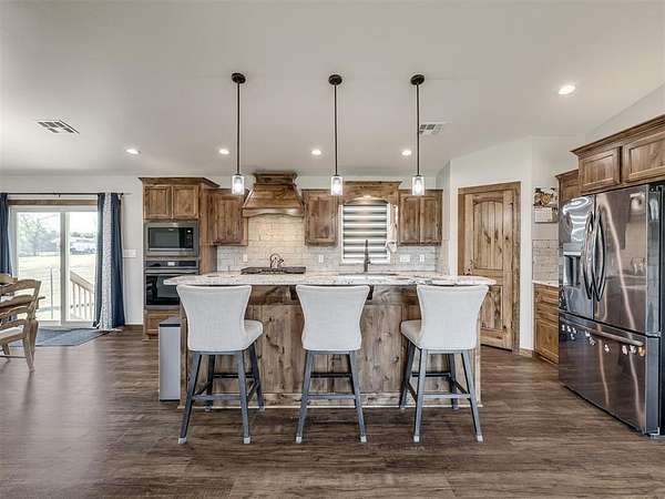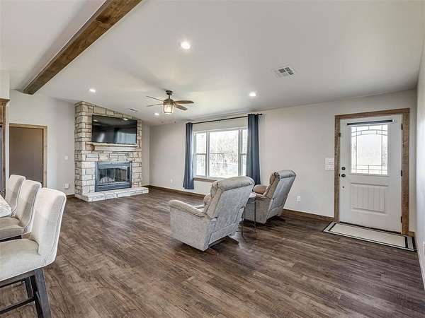 Newly built in 2023, this 3 bed, 2 bath home in McLoud offers 1,768 sq ft of living space and is set on 5 acres. From the moment you step inside, the open concept layout stands out with wood look flooring, a vaulted ceiling accented by a wood beam, and a striking stone fireplace in the living area. The kitchen is both functional and stylish, featuring warm wood cabinetry, a large center island with seating, a walk-in pantry, stainless steel appliances, and modern lighting that ties the space together seamlessly. The primary suite includes a spacious bathroom with dual sinks, walk-in shower, and walk-in closet. Outside, the property is accessed through a front gate and includes a fenced backyard area, along with a 2-car carport for covered parking, and an underground storm shelter for added peace of mind.