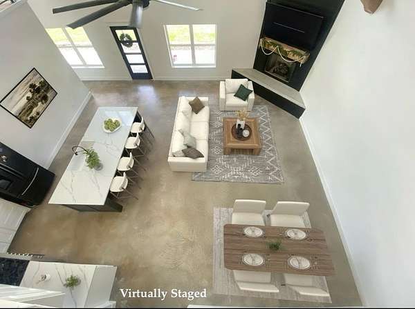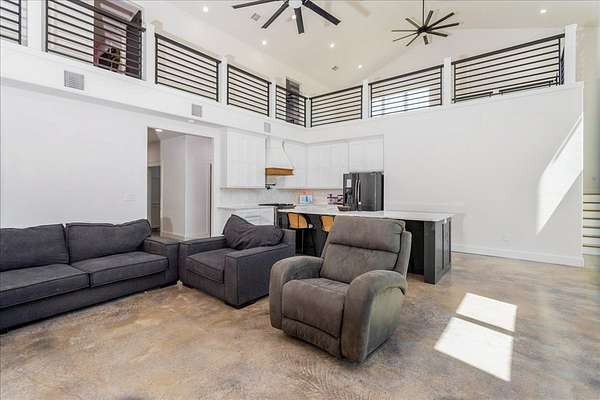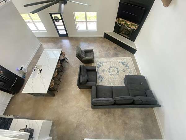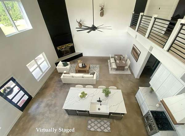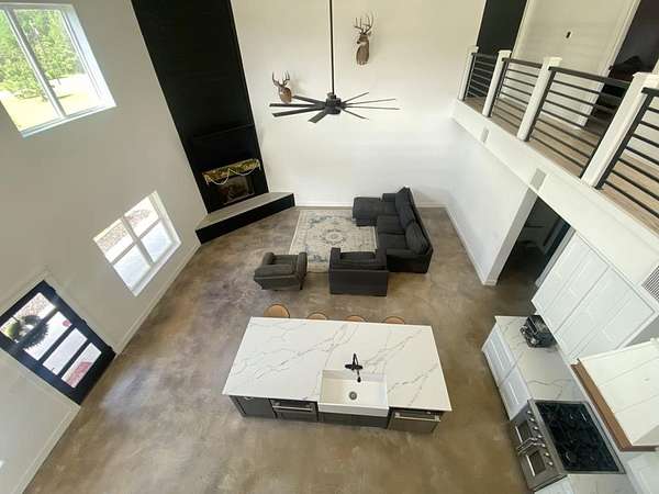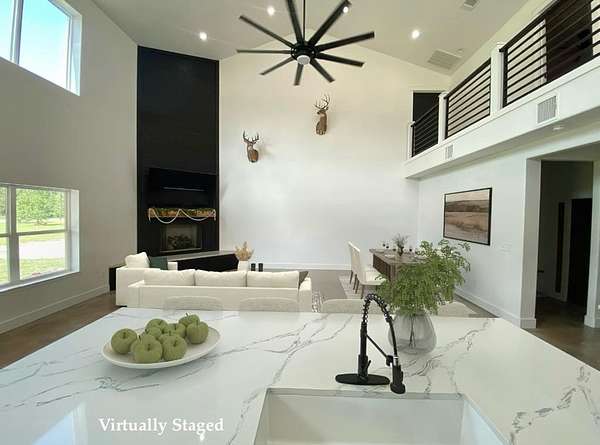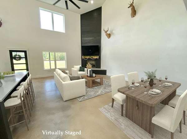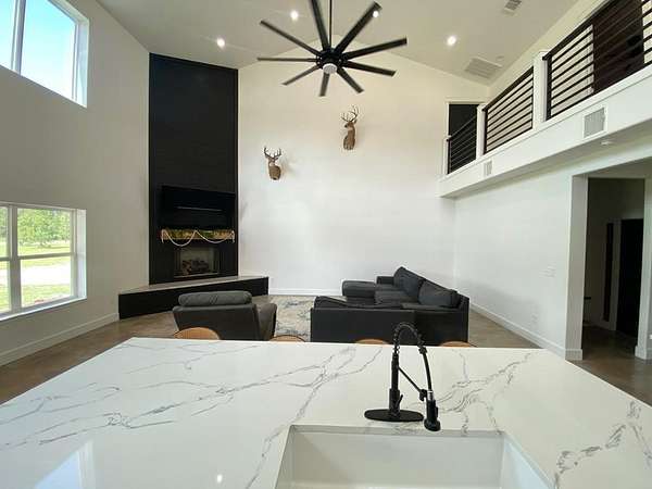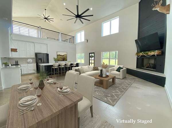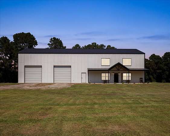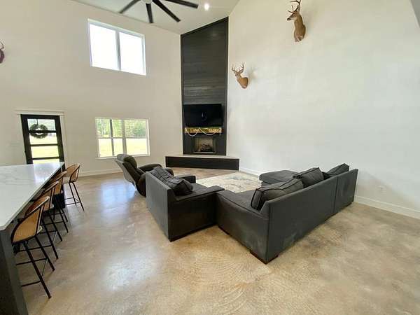 Welcome to your dream Barndominium! This 3,052 sq. ft. home on 4.3 acres offers 3 bedrooms, 2 full baths, and 2 half baths with an open-concept design. The gourmet island kitchen features quartz countertops, shaker cabinets, stainless steel appliances, farmhouse sink, seating for four, and a pot filler over the gas range. The living room boasts soaring 27-ft ceilings, a gas log fireplace, and abundant natural light. The master suite includes a huge walk-in closet, spa-style bath, and creative built-in storage. Upstairs, enjoy a landing with a metal railing, two spacious bedrooms with a Jack & Jill bath, plus a media room. Giant ceiling fans keep the living area cool. Polished concrete floor on first level. A 2,000 sq. ft. insulated shop accommodates cars, boats, & ATVs. Outdoors, relax on the covered patio with wood-plank ceiling, recessed lights, and fans. Perfect for families and outdoor enthusiasts, this property delivers modern comfort with plenty of space for all your adventures!