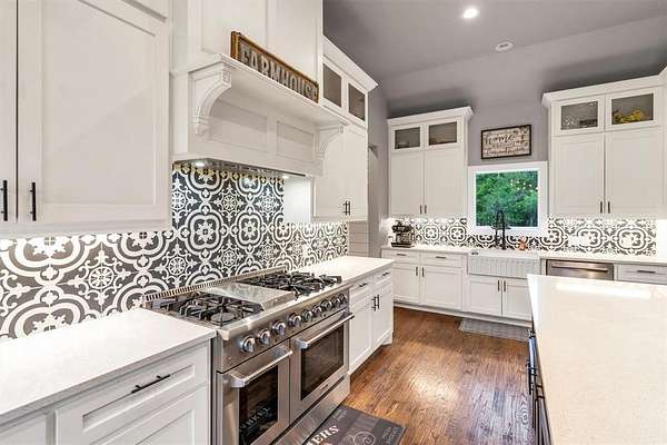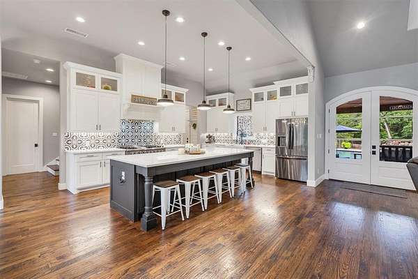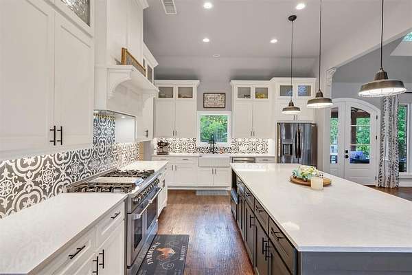 The heart of the home is the gourmet kitchen, complete with an oversized island and a chef's dream stove with double ovens--perfect for cooking, entertaining, and gathering. The open floor plan with hardwood floors creates a warm and inviting atmosphere, while large windows bring in plenty of natural light and showcase the peaceful, wooded surroundings.