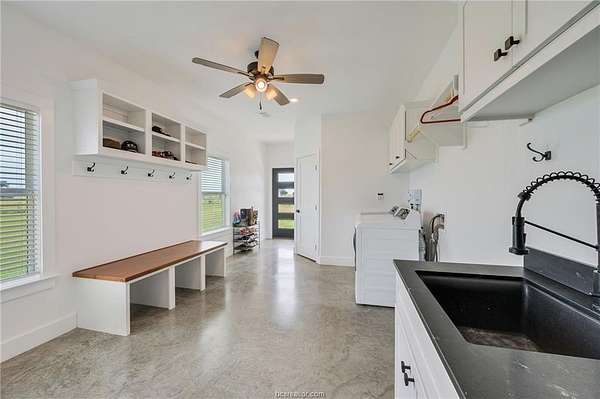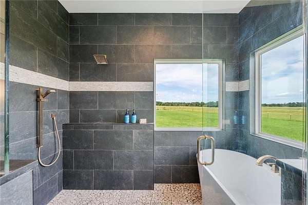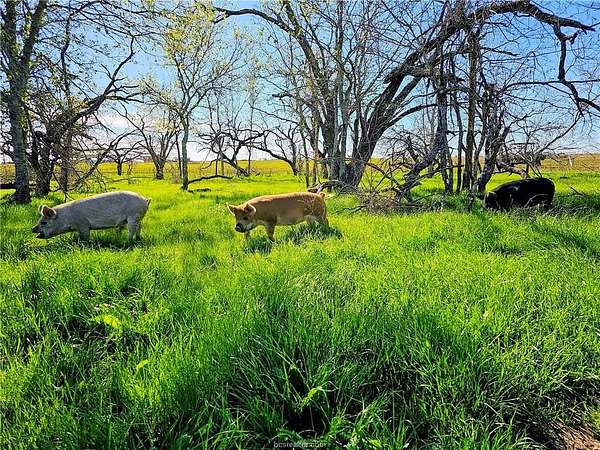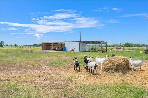 Discover this 76-acre Texas country gem-fully perimeter and cross fenced with graduated high-tensile fencing- ready for homesteading or ranching. A 1K+ foot driveway leads from over 3.5K+ feet of road frontage to a beautifully crafted 5-bedroom, 4.5-bath farmhouse built in 2023. This home features a metal roof, spray-foam envelope, plus a 500 sq ft attached garage that's insulated, cooled and easily converted into living space. The open concept living has cathedral ceilings, custom cabinetry, and built-ins throughout. The chef's kitchen boasts double islands, farmhouse sink, quartz countertops, modern open shelving, and expansive walk-in pantry. The cathedral ceiling continues into the primary suite, featuring picture windows, spa-like bath, and large walk-in closet. The four additional bedrooms share two Jack-and-Jill style bathrooms. The laundry/mud room has a full bath. Whole-house water filter/softener system. The 40'X48' red barn/shop on slab with water, power and a 40' x 12' climate-controlled section with full bath. Additional features: - Young orchard and tranquil garden with 18 raised beds, arched trellises, and drip irrigation - 52'X 12' flat-roof barn - 40' X16' carport with water/power - Multiple animal shelters - Pond and ten 1/3-acre hog paddocks with mature trees - Buried water lines to all pastures and pens distribute county water - Centralized pen with squeeze chute connects 4 gated pastures - Located just 47 miles from Kyle Field and 52 miles from Waco!