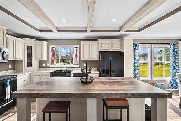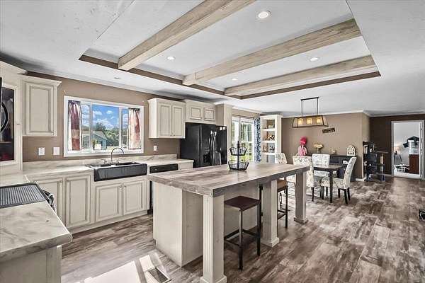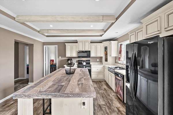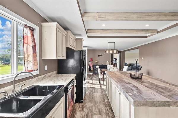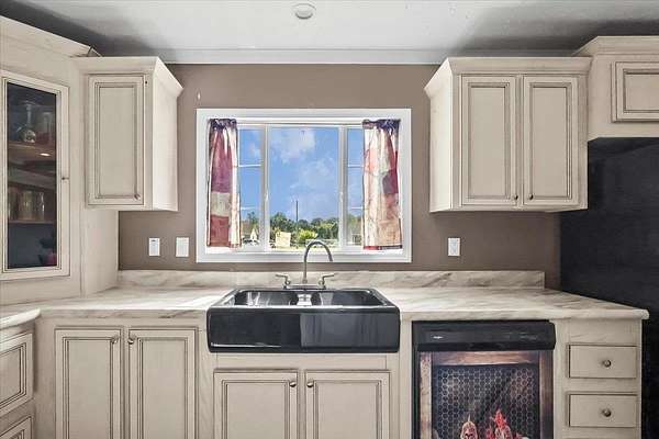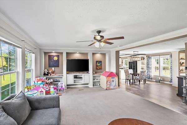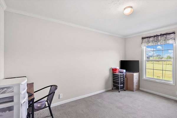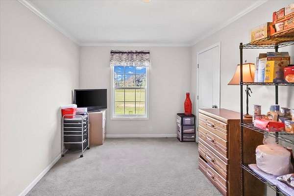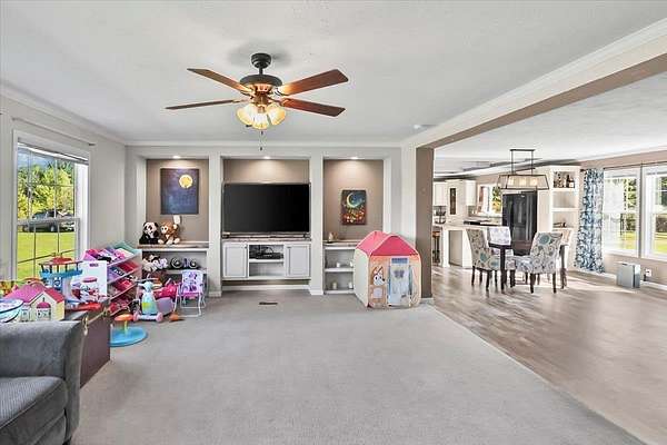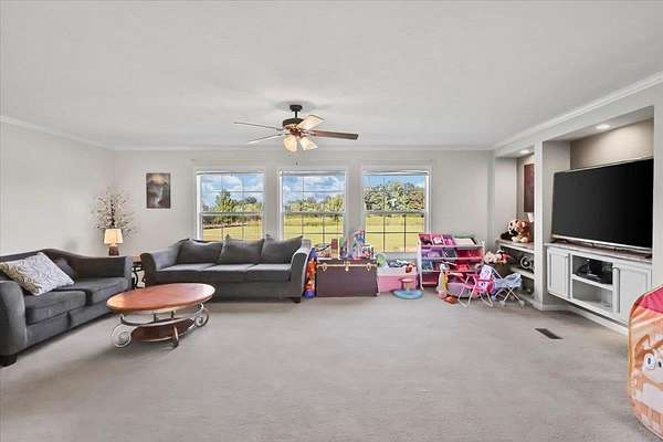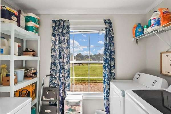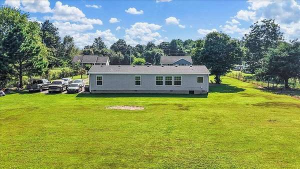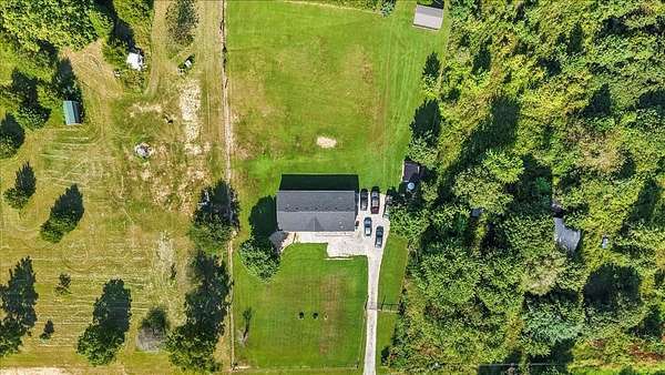 Set on over 3 acres, this home features spacious open-concept living with a kitchen that includes an oversized island with outlets and a farmhouse style sink, plus a huge living room with built-ins and lots of natural light. All three bedrooms include walk-in closets, and the primary suite additionally offers a garden tub with separate shower. The large laundry room adds extra convenience and storage possibilities. Outdoors, enjoy a fully fenced property with gated entry, a walking path around the perimeter, dog kennel with solar fan and lights, carport, and a lean-to style storage building at the back of the lot.