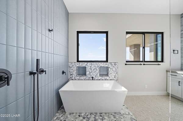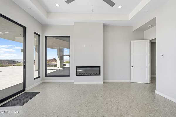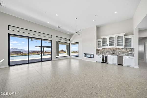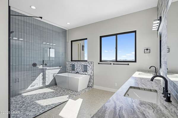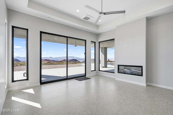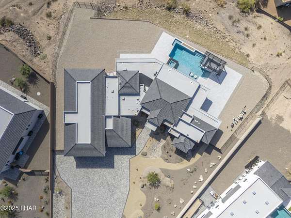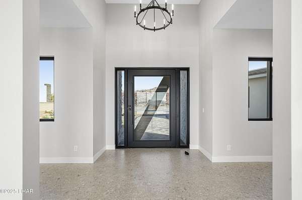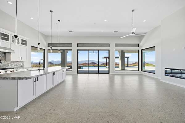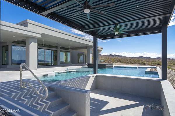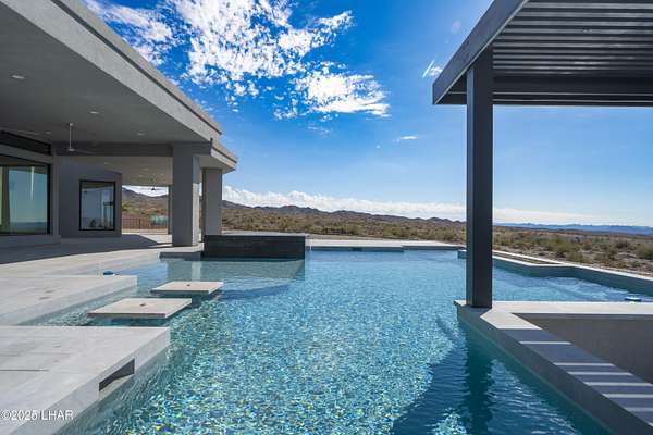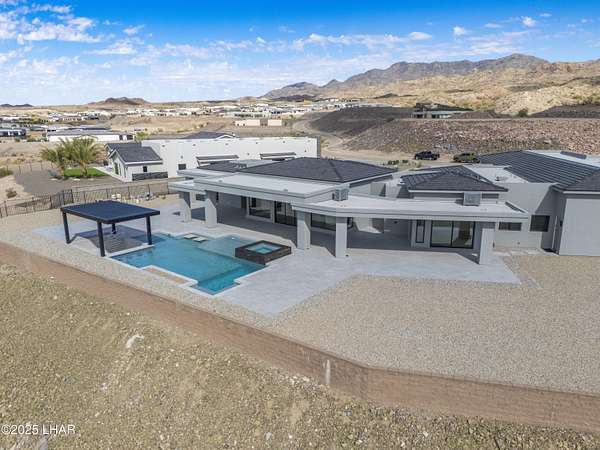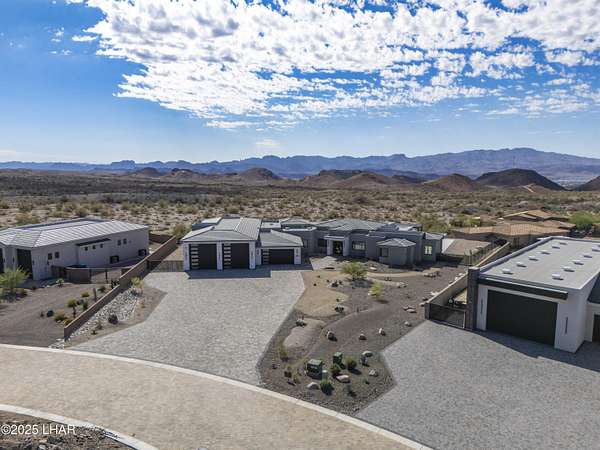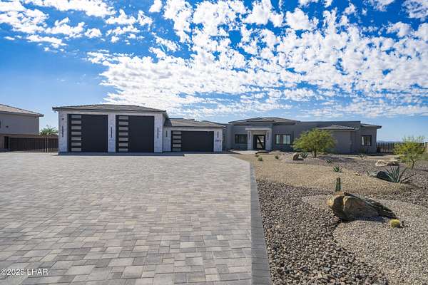 Welcome to 2973 Plaza Enclave The Ultimate Lake Havasu Luxury Retreat. Experience elevated desert living in this tranquil estate style masterpiece showcasing panoramic views, a resort-inspired pool and spa, all-ensuite bedrooms, and unparalleled privacy, all set on a 1.31 acre lot backing to BLM land with direct backyard access. Over 3,100sqft of meticulously designed living space, this home exudes craftsmanship and sophistication. Enter through a grand pivot door into an open great room with a custom wet bar and a gourmet kitchen boasting commercial grade appliances and a hidden butler's pantry. The owner's suite is a private sanctuary with a fireplace, soaking tub, massive walk-in shower, and expansive closet. Outside, enjoy a very private resort-style pool and spa with a Baja shelf, and a sprawling tiled patio. Feels like vacation every time you arrive home! Everyone will appreciate the 3500sqft of DOUBLE DOUBLE RV garages, 2-car garage, and gated side parking.