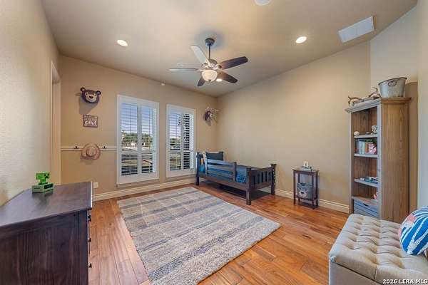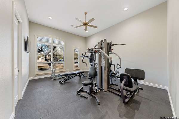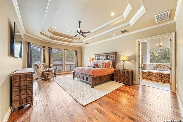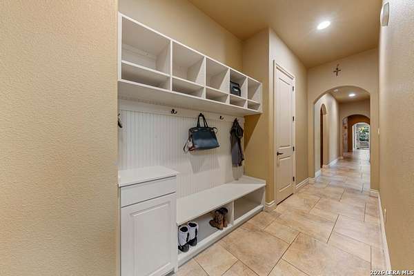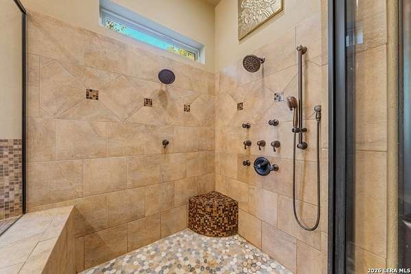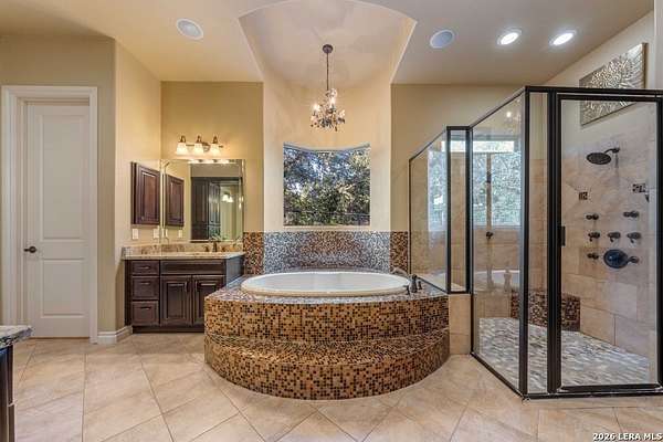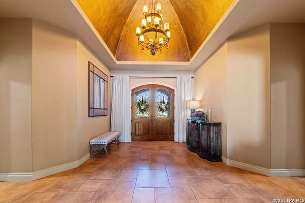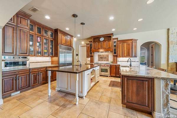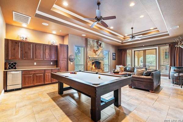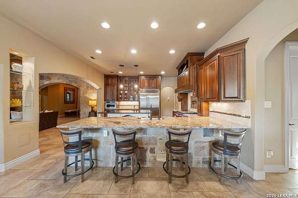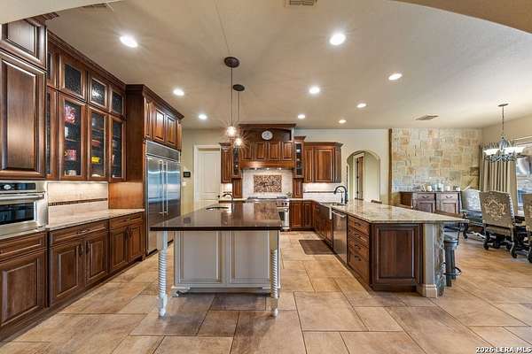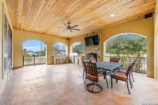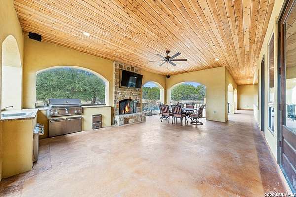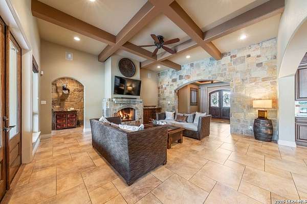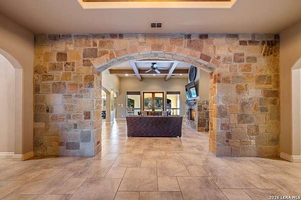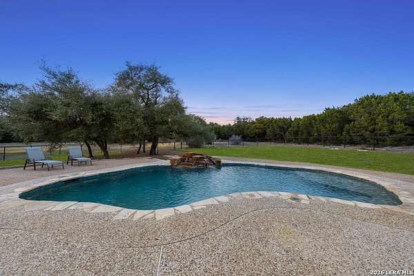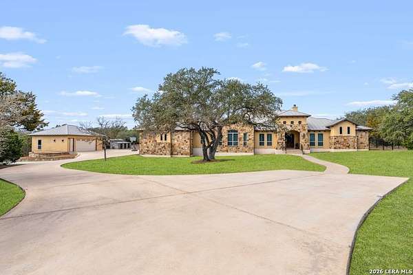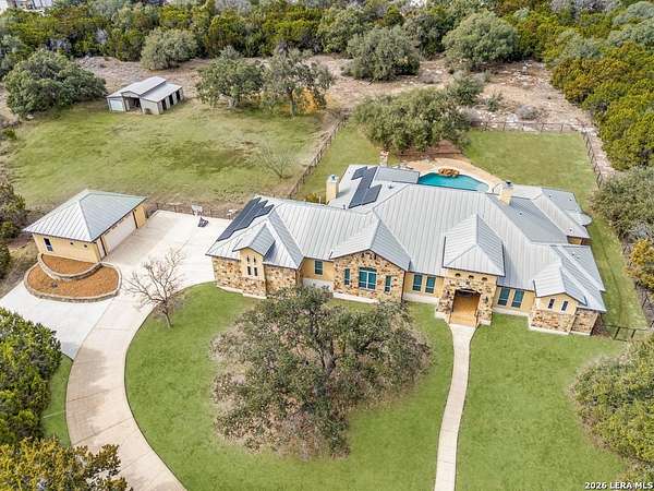 Hill Country elegance welcomes you home at 29745 Ancestral Trail, a secluded retreat in the gated Castle Rock community just off Highway 281. Set on five acres with a barn and Keith Zars pool, this luxurious single-story home features a striking rock exterior and expansive living spaces that blend Hill Country warmth with refined sophistication. The home offers a chef's kitchen, formal dining area, study, five bedrooms, six bathrooms, laundry room, and two living areas-each anchored by a rock fireplace. A grand foyer with stone accent walls leads into an open family room filled with natural light and views of the pool, open skies, and Texas wildlife. The kitchen is the heart of the home, featuring rich wood cabinetry, a large center island, a Wolf gas range with dual ovens, pot-filler faucet, built-in Northland refrigerator, and ample workspace. The secondary living room with a bar and fireplace provides the ideal space for a game room or media lounge. Escape to the primary suite with a spa-like bath, dual walk-in closets, soaking tub, and separate shower. Secondary bedrooms are generously sized with dedicated baths, while a thoughtfully placed guest bathroom enhances hosting ease. Storage and functionality abound with an attached three-car garage tall enough for a lift with built-in shelving, plus a two-car detached garage ideal for hobbies or additional vehicles. Outdoors, enjoy a private backyard oasis with a covered patio, full outdoor kitchen, fireplace, and resort-style Keith Zars pool-perfect for entertaining or relaxing in Hill Country serenity. The barn and acreage accommodate animal lovers, with horses, goats and cattle permitted by the HOA. Luxury, comfort, and Hill Country serenity await-schedule your private showing today.