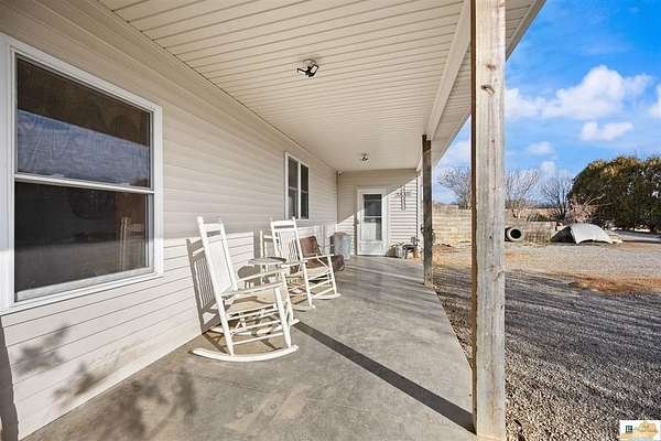 - Barn, Concrete Walks, Covered Front Porch, Exterior Lights, Landscaping, Outdoor Lighting