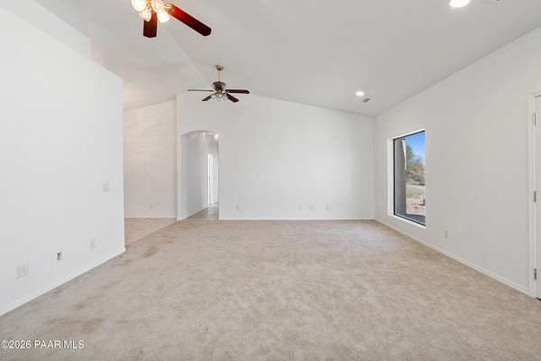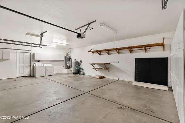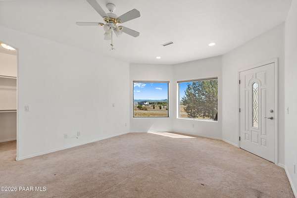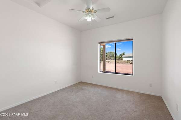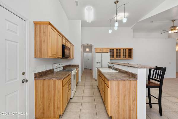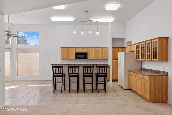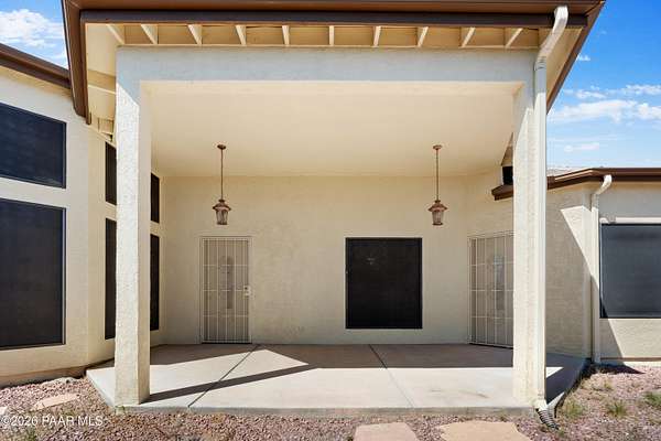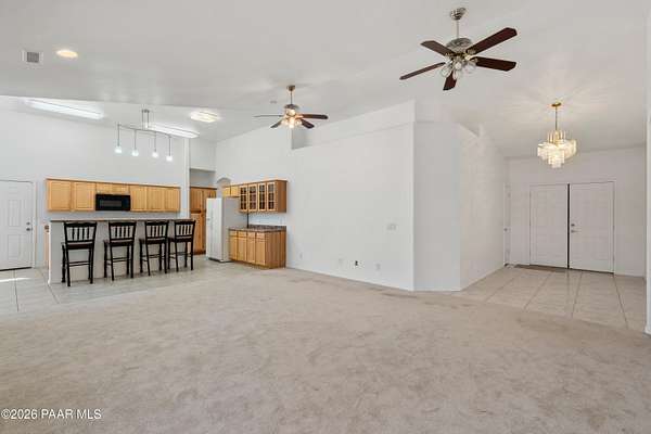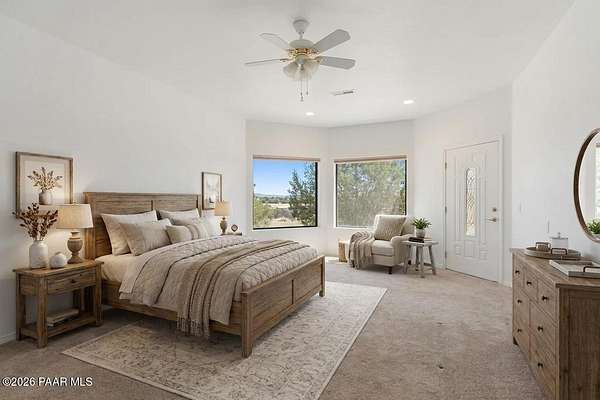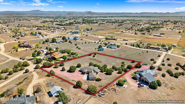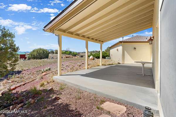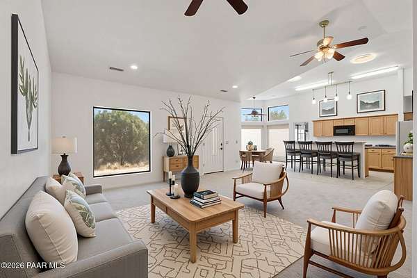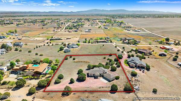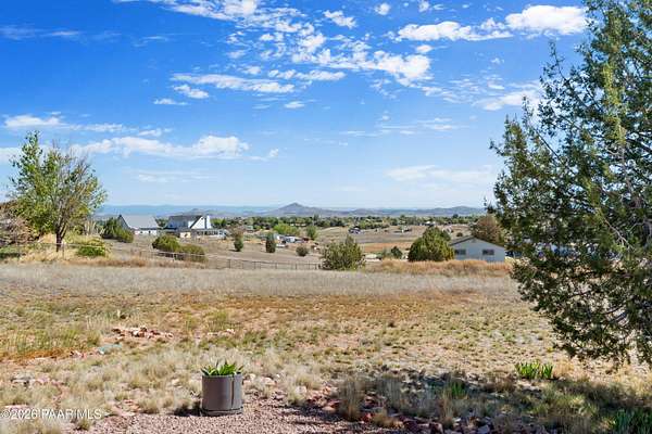 Charming rural home in Chino Valley, peacefully situated at the end of a street for privacy yet still close to town amenities. Set on two acres with huge views, this well-maintained residence features three bedrooms and two bathrooms including a soaking tub in the master and tall 9-ft+ ceilings that enhance the bright, open feel. The spacious kitchen offers tons of cabinets, and the property includes a three-car garage, a large, covered patio for outdoor living, landscaped front and back yards, a huge producing well, and a perimeter fence for security or pet containment. The acreage is ideal for horses or recreational vehicles, with ample space for corrals, storage, or outdoor hobbies, making this property well-suited for country living and active lifestyles.