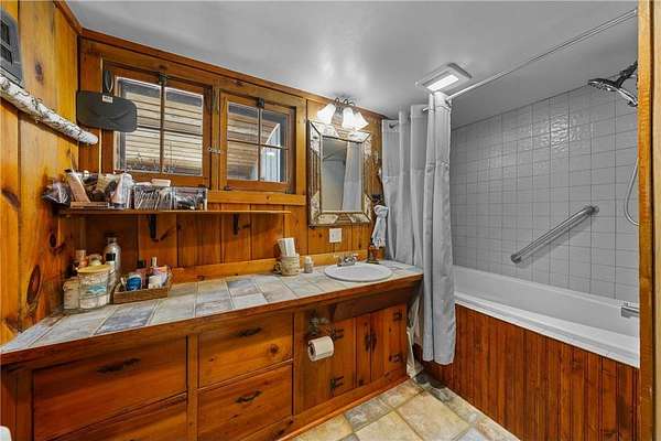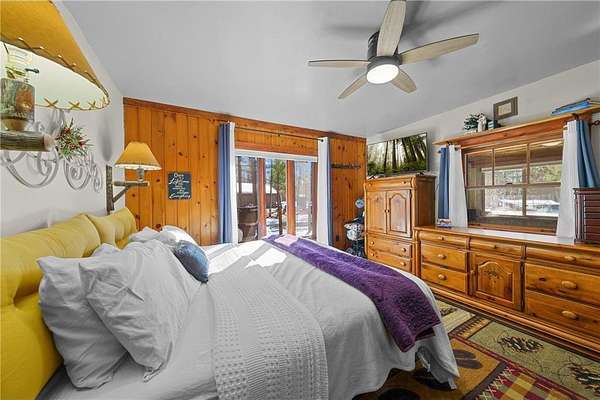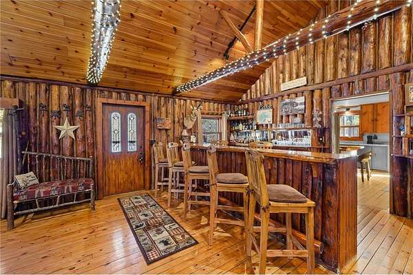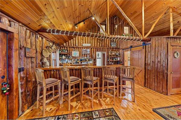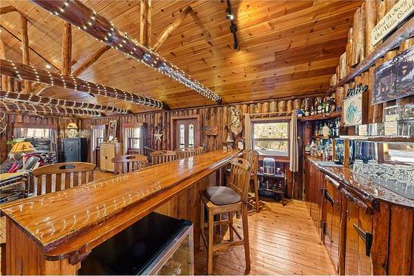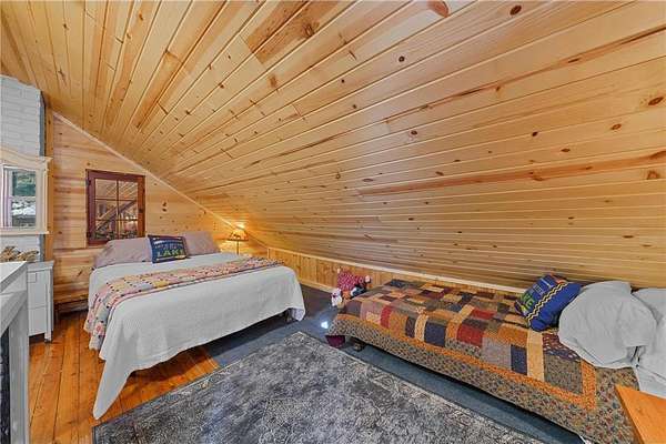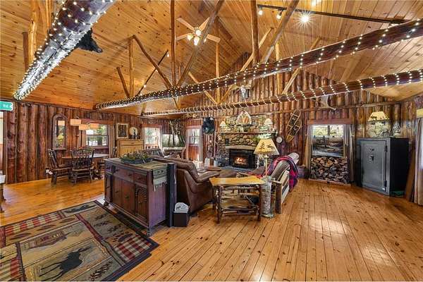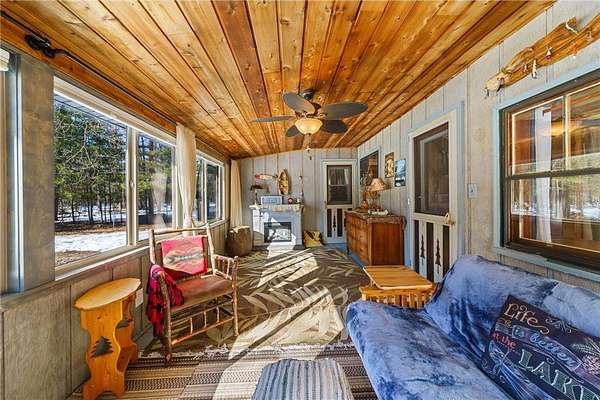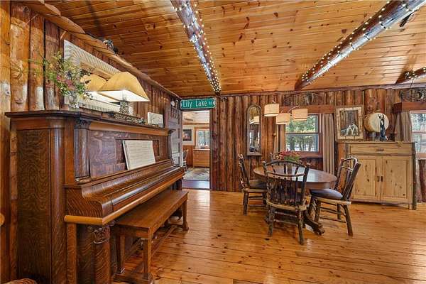 Log home with 176 feet of shoreline on Lily Lake, 4.5 private acres & newly built garage. Originally built in 1945 and once home to The Rustic Inn, this property has been thoughtfully restored to preserve the history while also making great use of the converted space. Nostalgia remains in tact throughout, from the original bar (still in place) to the 1906 player piano. The kitchen retains its original cabinetry and updated with stainless appliances and gas range. 2 Main-level bedrooms, with primary and additional bath. Upper loft bunk area overlooks the living room. 3-season insulated porch leads to new decks and sidewalks. New chinking inside and out, wood-burning insert, updated lighting, newer septic (6 years), drilled well, Kinetico water system, and new water heater. A newly built heated garage with front and rear doors offers exceptional space for vehicles and toys. Bonus charm: meticulously maintained outhouse (serviced regularly) and chicken coop. Dock is included with the sale.